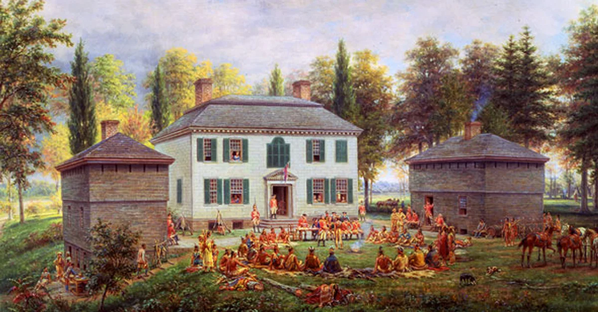 A depiction of Sir William Johnson holding a conference with the Iroquois at his home of Johnson Hall in 1772, painting by Edward Lawson Henry, 1903.