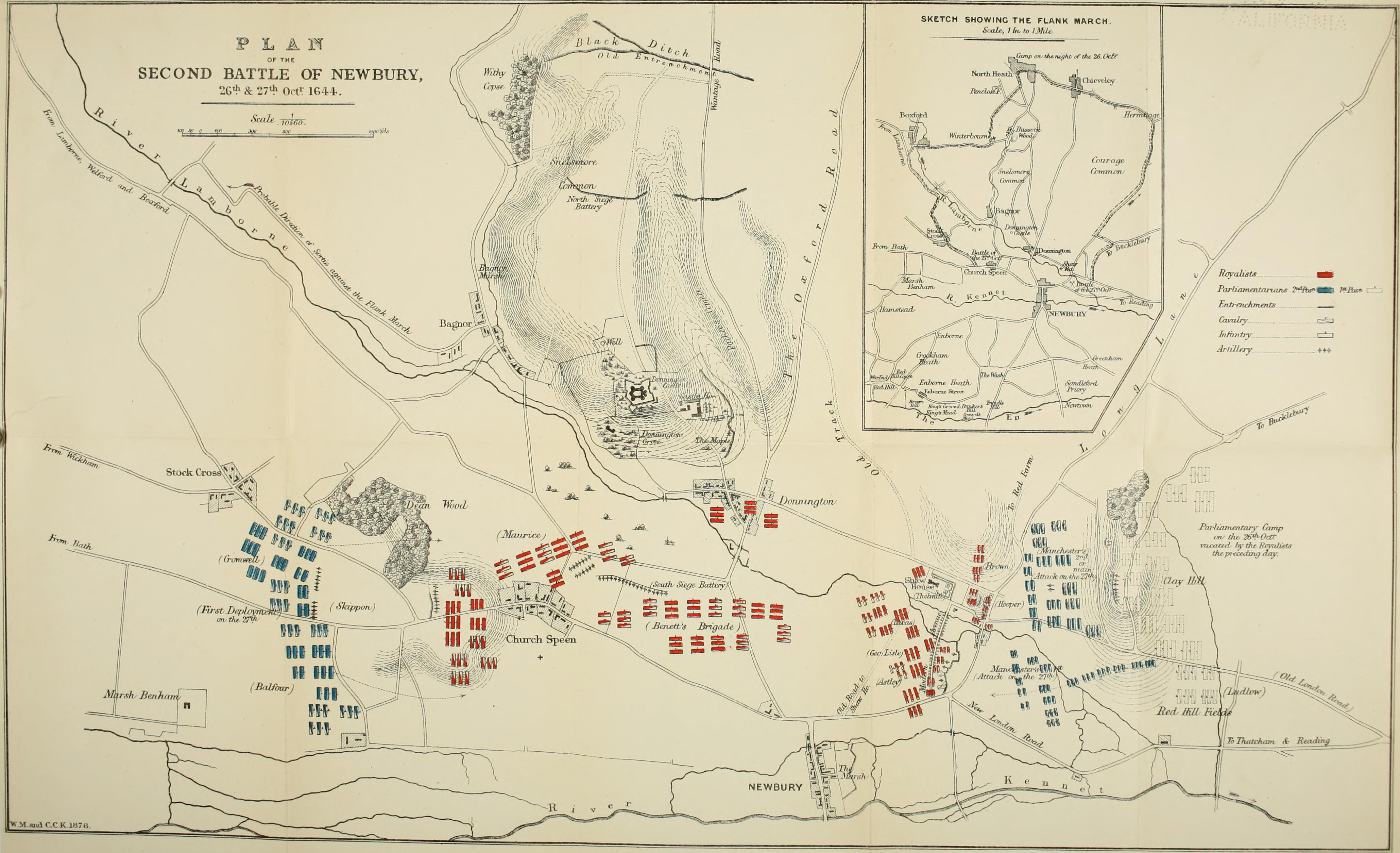 The troop dispositions of the Royalists (red) and Parliamentarians (blue) at the indecisive Second Battle of Newbury in October 1644 during the English Civil Wars (1642-51). (1844 illustration by Walter Money)