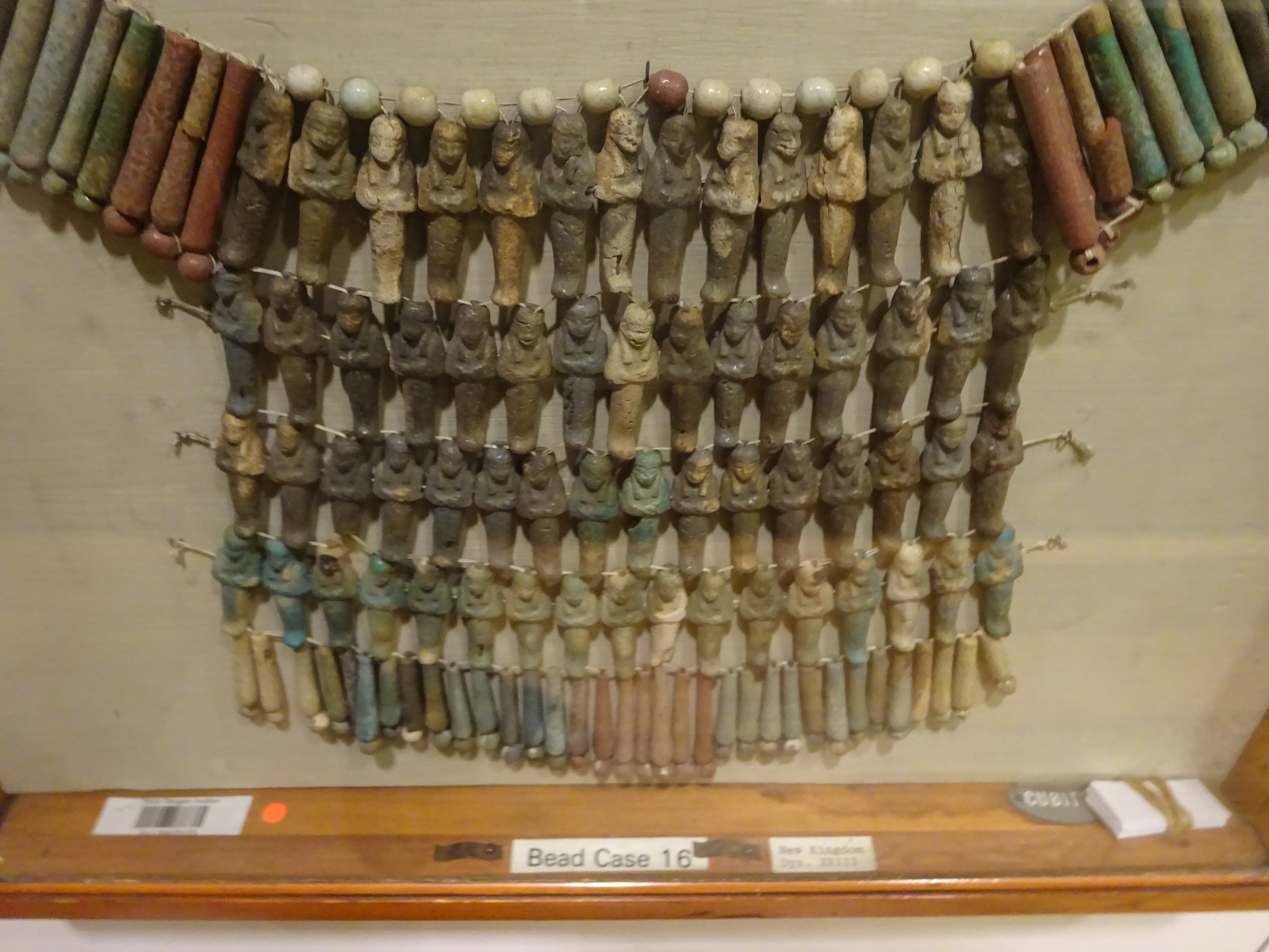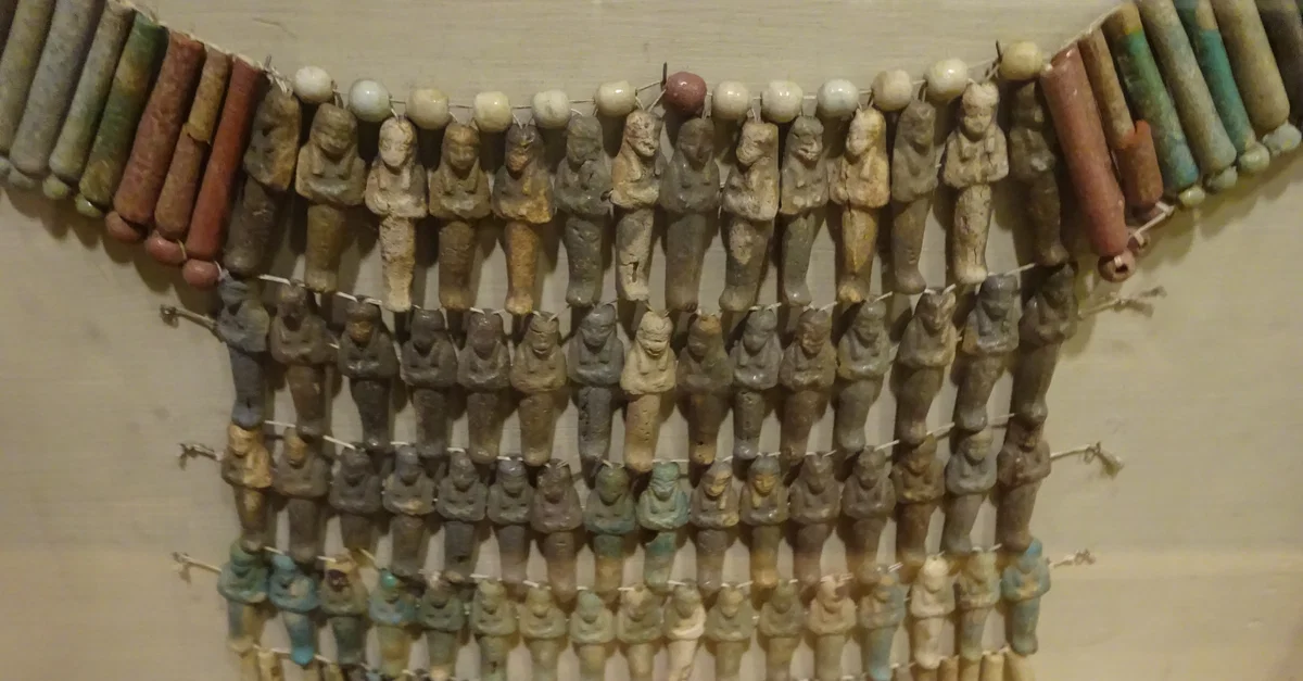 This unique broad collar (a type of necklace that was favored amongst the gods, pharaohs, and elite) is dated to the 21st Dynasty (11th-10th century BCE) and contains 62 faience shabti figures that are each about four centimeters in height. While broad collars were worn while a person was living, mummies were also buried wearing them.