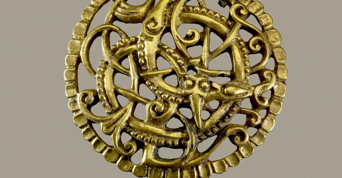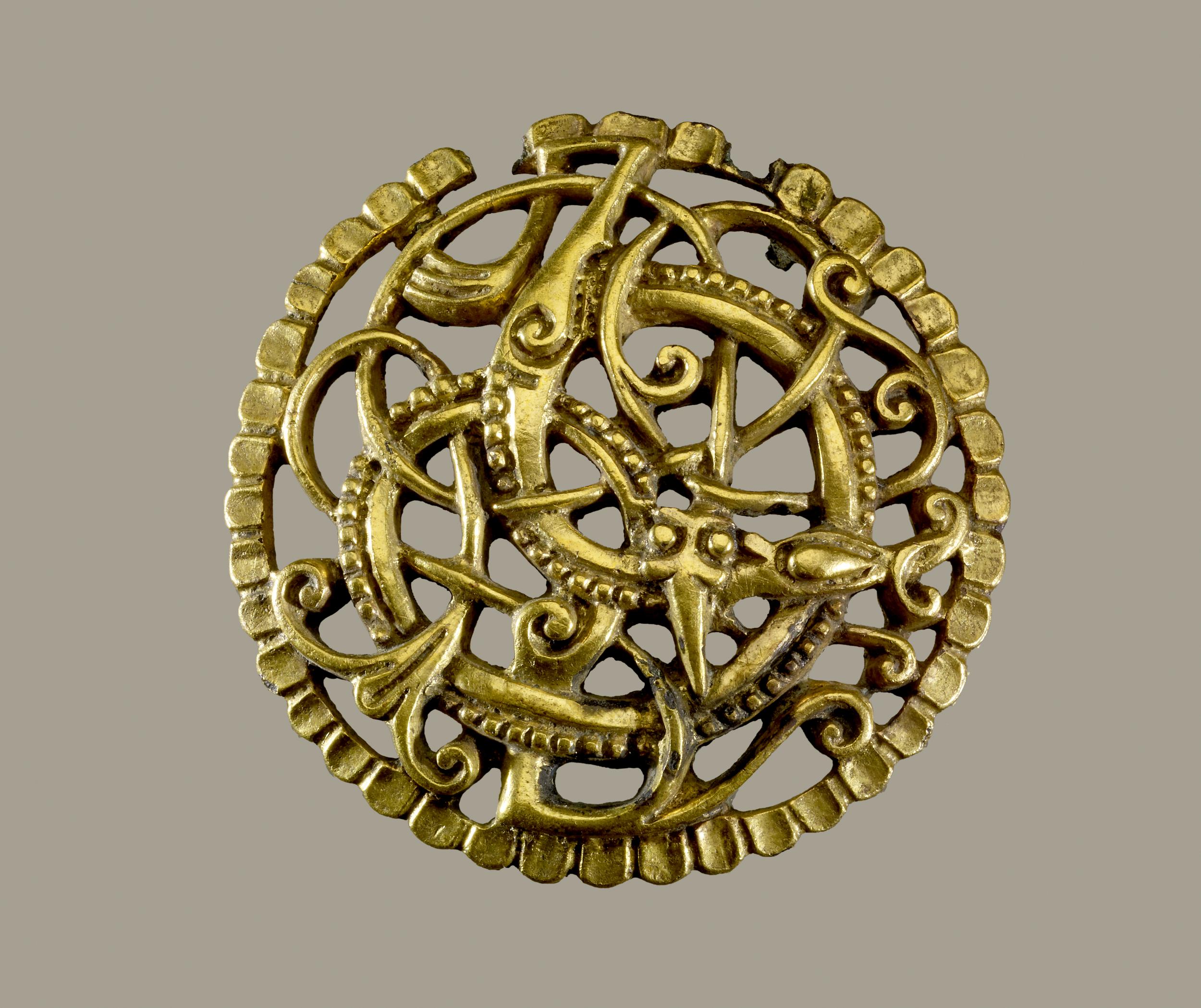 Dished gilt copper-alloy disc brooch, Urnes style, from Pitney, Somerset, c. 11th century.