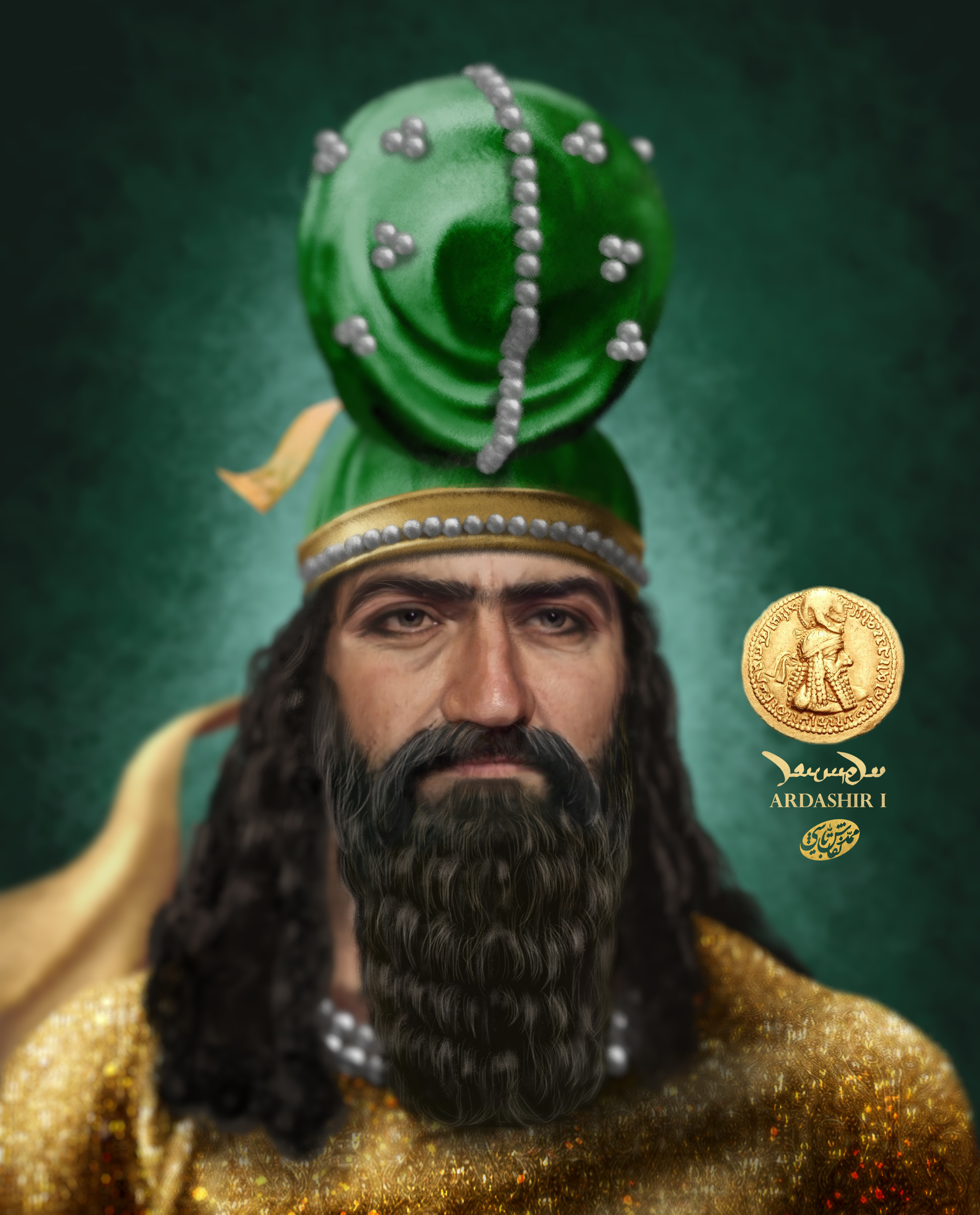 A visual representation of Ardeshir I (the Unifier), founder of the Sasanian Empire (Larger Iran). This representation is largely based on visual evidence found on coins and a number of rock reliefs he has left in Naqsh-e Rostam and Firoozabad.