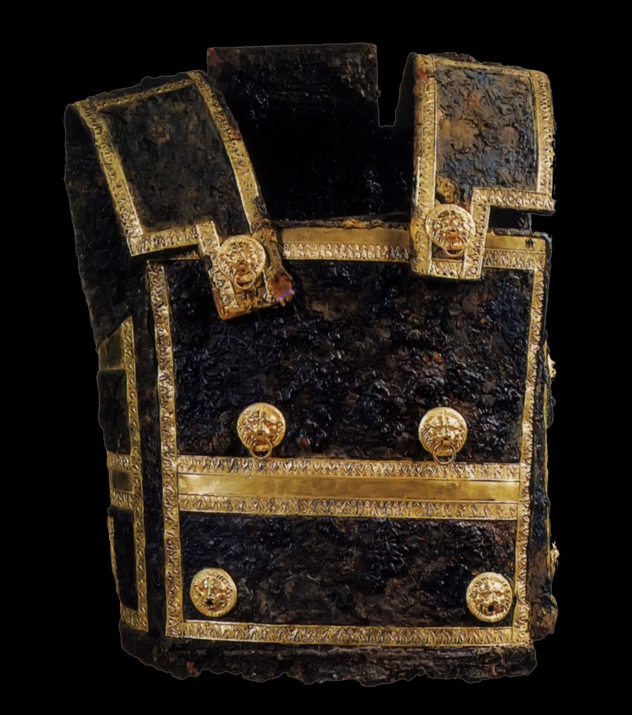 Iron core of linothorax with golden buckles found in Macedonian Tomb II of Vergina, Imathia, Central Macedonia, Greece. The tomb is dated to between the end of the 4th century BCE and the beginning of the 3rd century BCE. Located at Archaeological Museum of the Great Tumulus of Vergina, Central Macedonia.