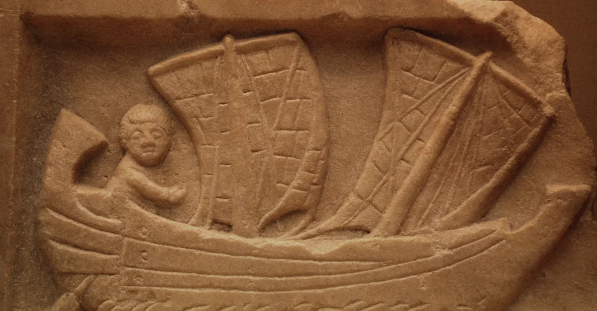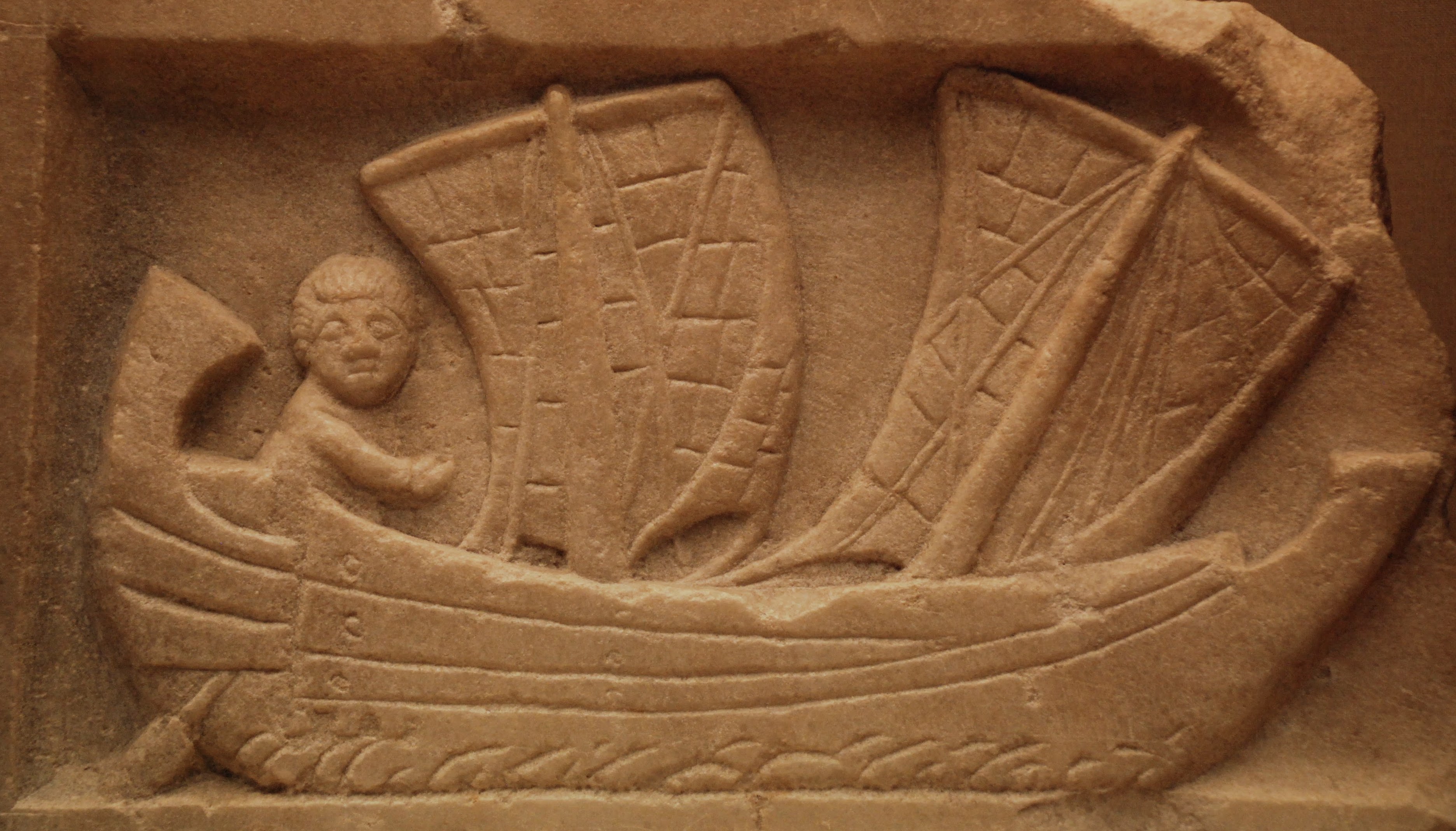Roman marble relief showing a small two-masted coastal sailing vessel called corbita, as well as its sailour. Found at Carthage and possibly made in Africa Proconsularis (modern-day Tunisia) circa 200 CE.