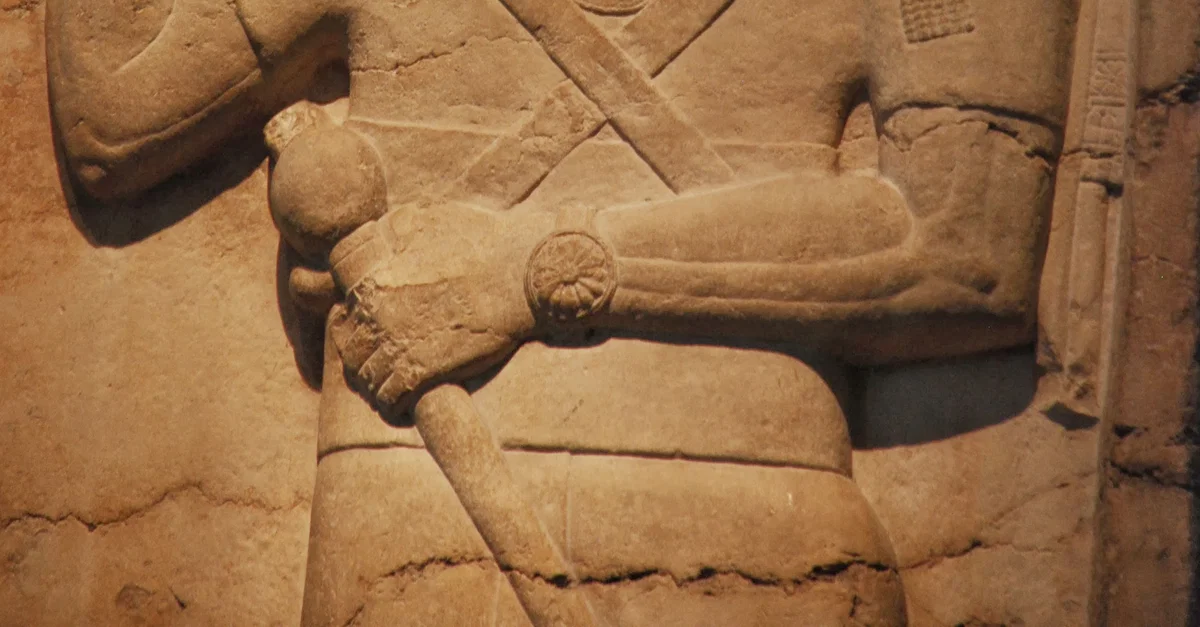 Assyrian stela of Shamshi-Adad V (823-811 BCE) from the temple of Nabu in Nimrud, c. 814 BCE, showing the kind worshipping symbols of the gods. The cross on the king's chest is a symbol of the sun god. Through his dress the Shamshi-Adad V is depicted as king of Babylon after the defeat of Marduk-balassu-iqbi in 814 BCE.