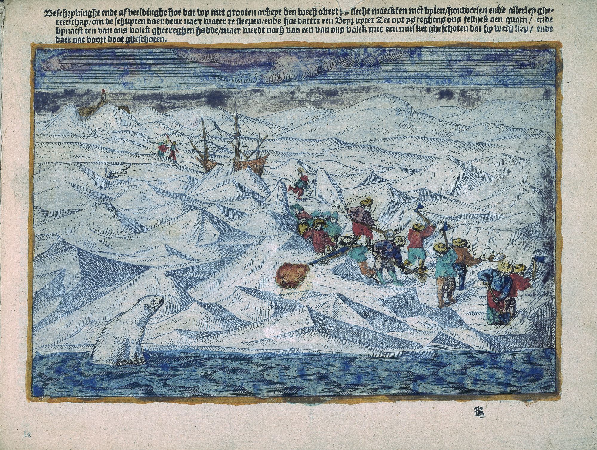 A Depiction of Willem Barentsz's three expeditions in search of the coveted Northeast Passage to Cathay (China) and the Spice Islands. Woodcut. 1598.