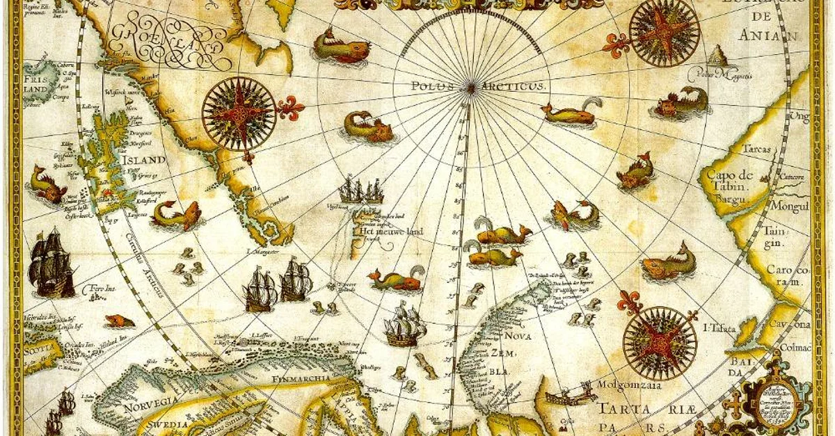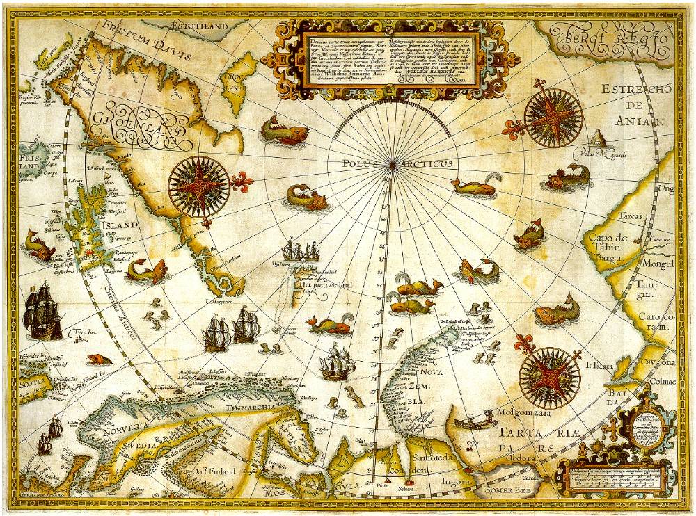 1598 Map of the Three Arctic Voyages (1594–1596) by Willem Barentsz. Spitsbergen (now Svalbard) is mapped for the first time and indicated as "Het Nieuwe Land" (Dutch for "the New Land"), centre-left.