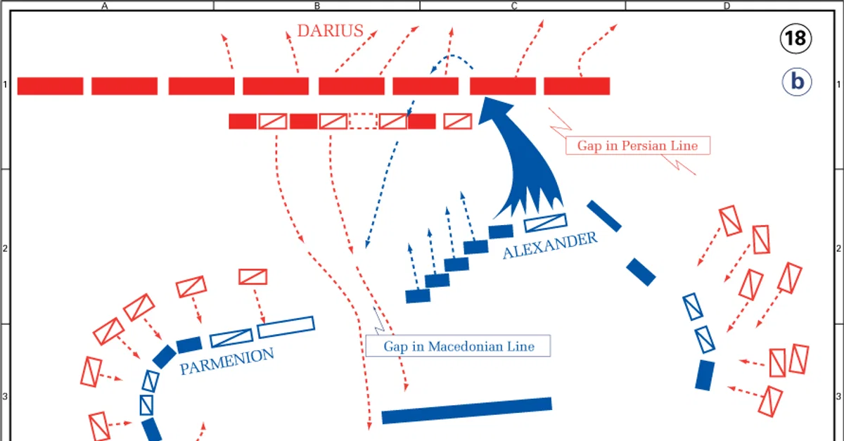 A map of the battle of Gaugamela depicting Alexander the Great attacking Darius III, a move that led to victory.