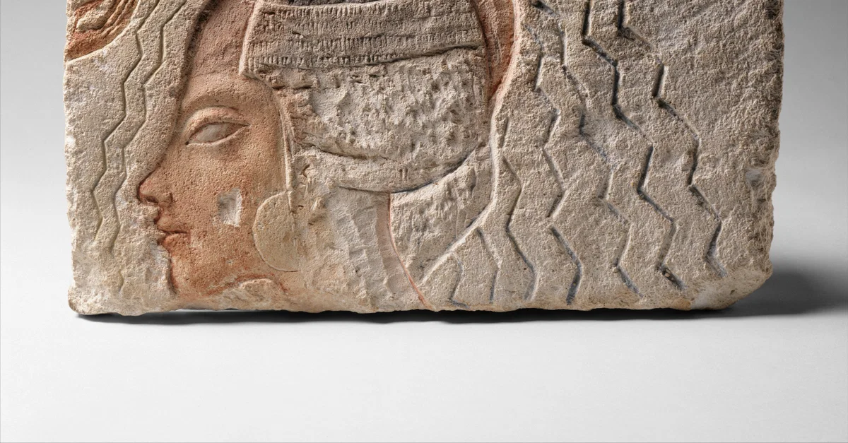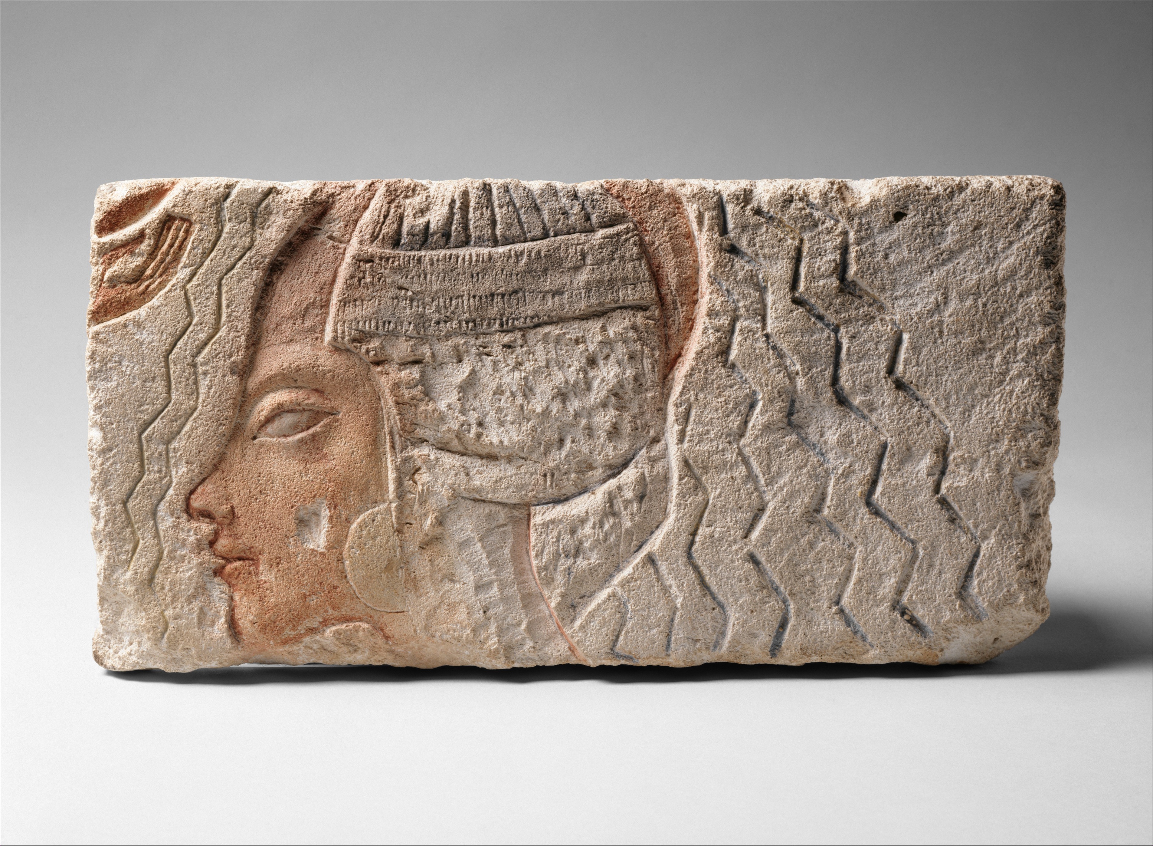 This fragment depicting a royal woman undergoing a purification ritual probably represents Queen Kia from c. 1353–1336 BCE during the Amarna Period of Egypt. It is housed at the Metropolitan Museum of Art.