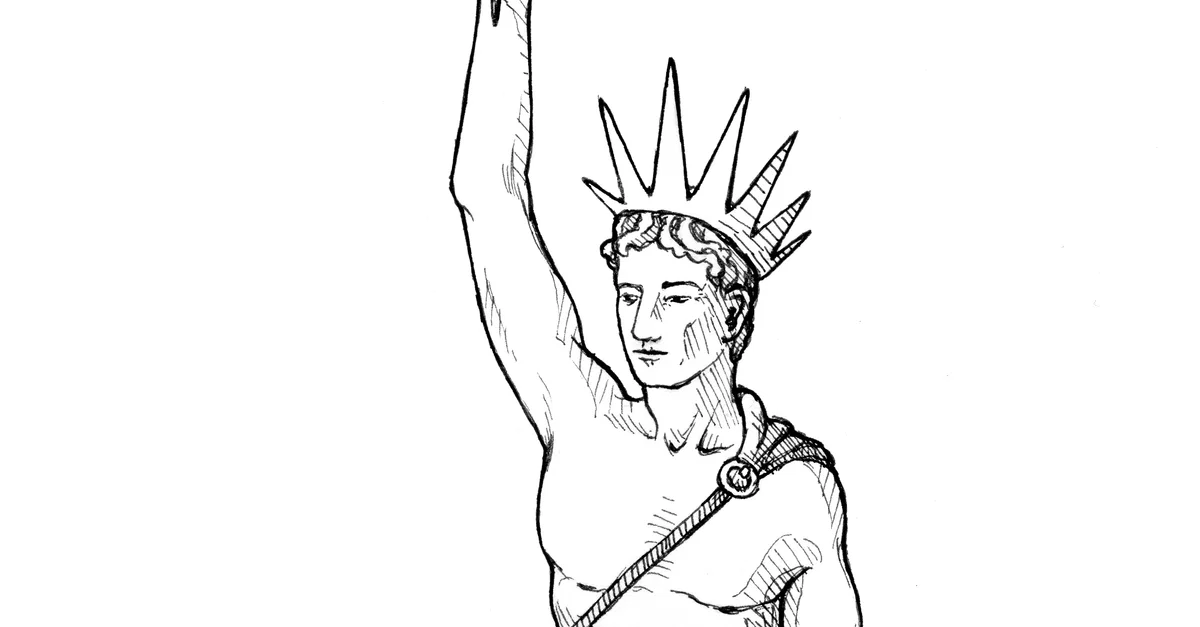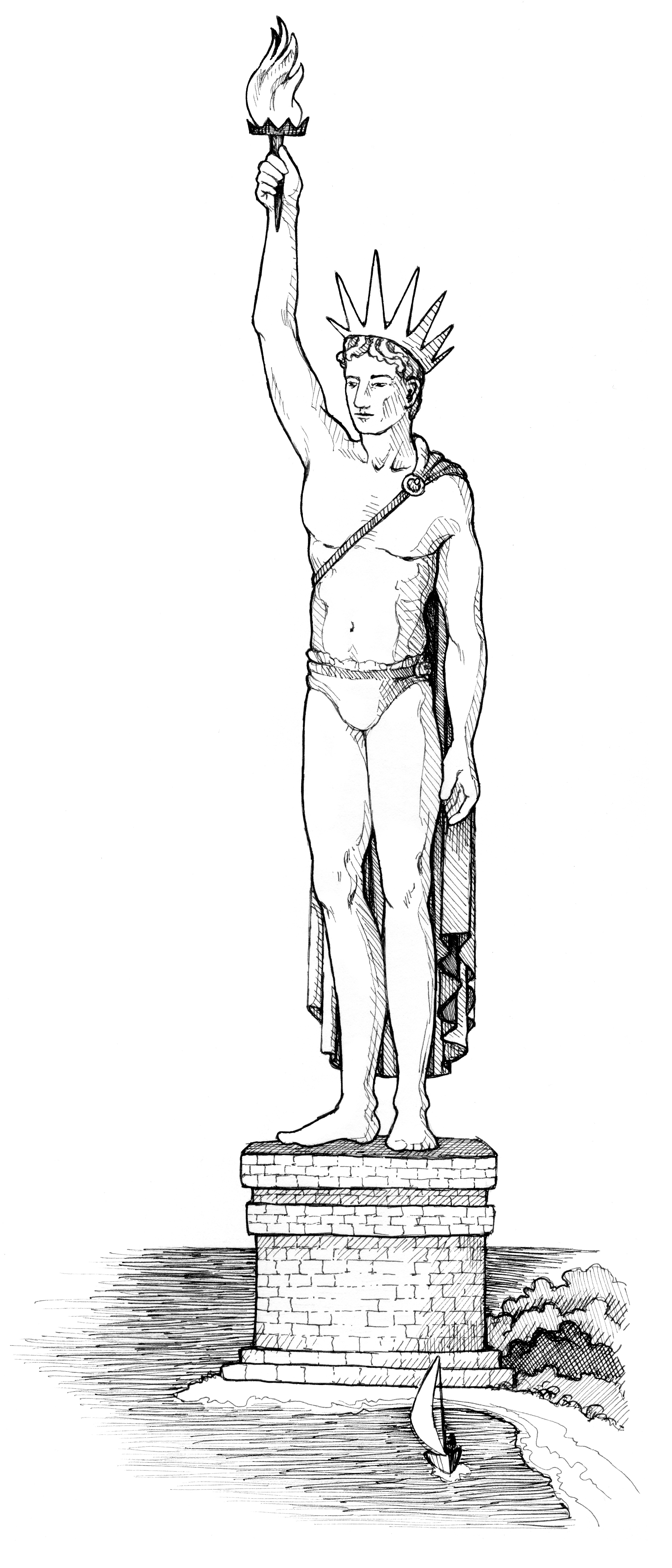 An illustration by Maia Kobabe showing the Colossus of Rhodes. The Colossus of Rhodes was a gigantic 33-metre-high bronze statue of the sun god Helios which stood by the harbour of that city from c. 280 BCE.