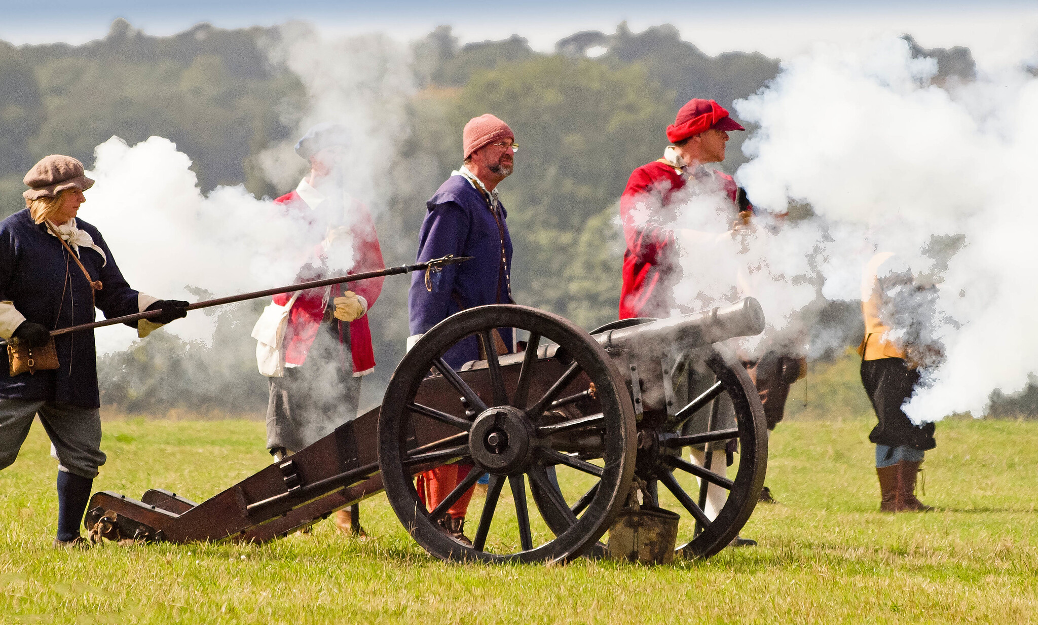 English Civil Wars (1642-51) re-enactors of the Sealed Knot firing a cannon.