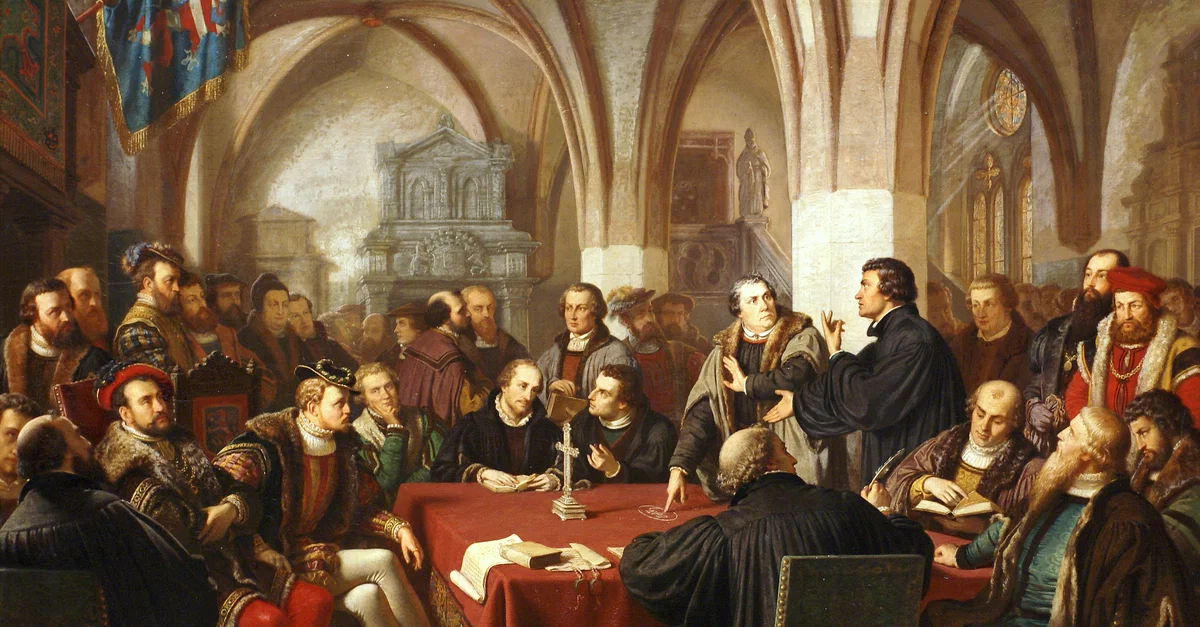 Marburg Colloquy, a meeting between Huldrych Zwingli and Martin Luther, leading figures of the Protestant Reformation in 1529, oil painting by Christian Karl August Noack, 1867.