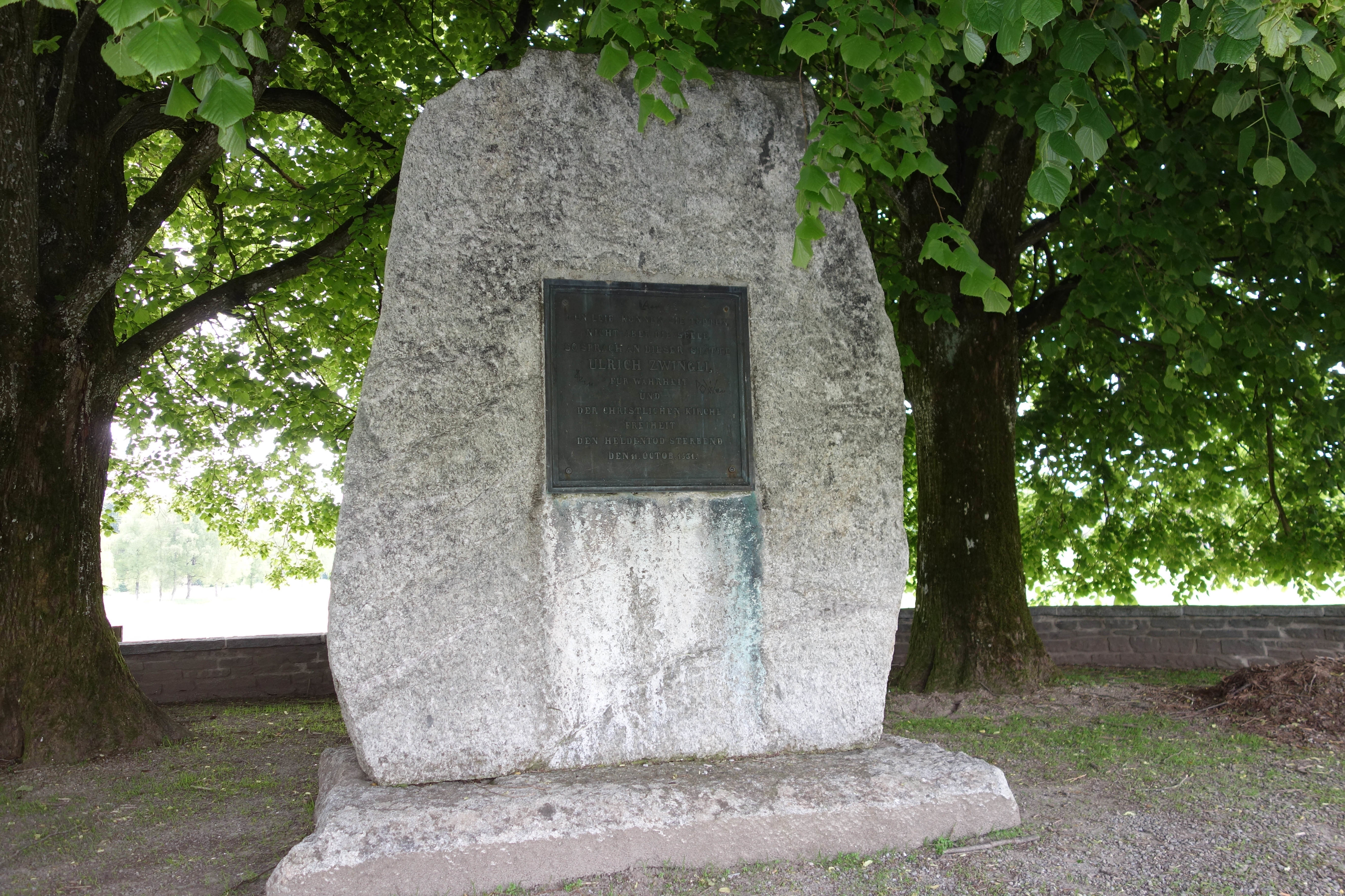 A photo showing the memorial stone of the Swiss reformer Zwingli. Located at Kappel am Albis.