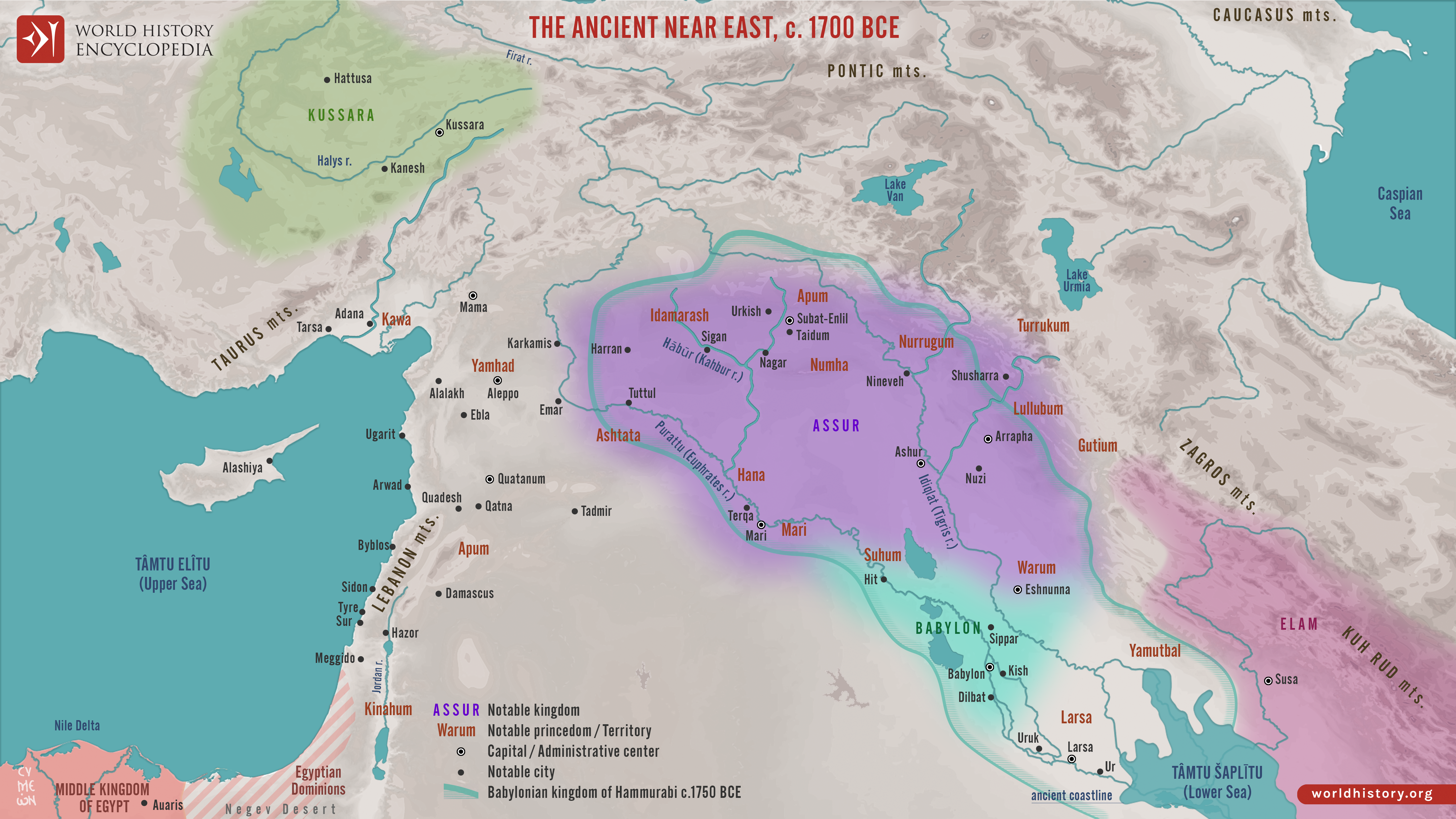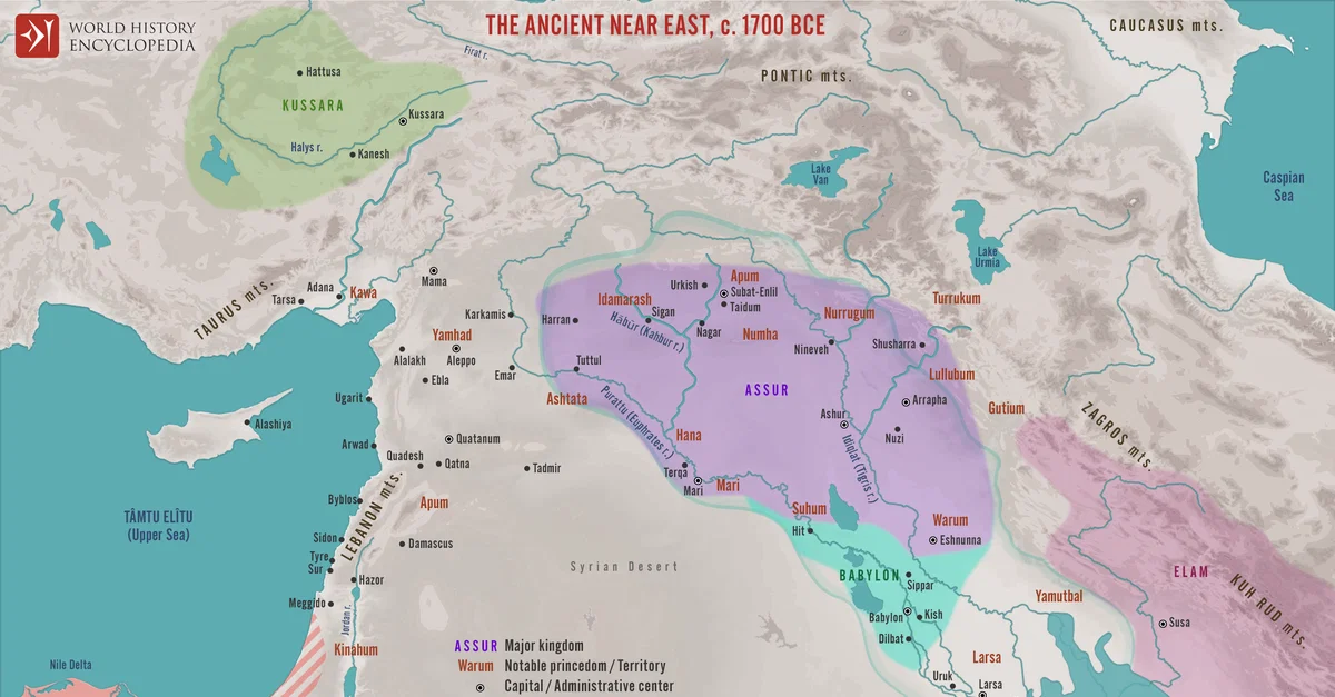 Netchev, S. (2022, January 18). Map of Tthe Ancient Near East c. 1700 BCE: The Old Assyrian Empire - between cities and kingdoms. World History Encyclopedia. https://www.worldhistory.org/image/15146/map-of-tthe-ancient-near-east-c-1700-bce/