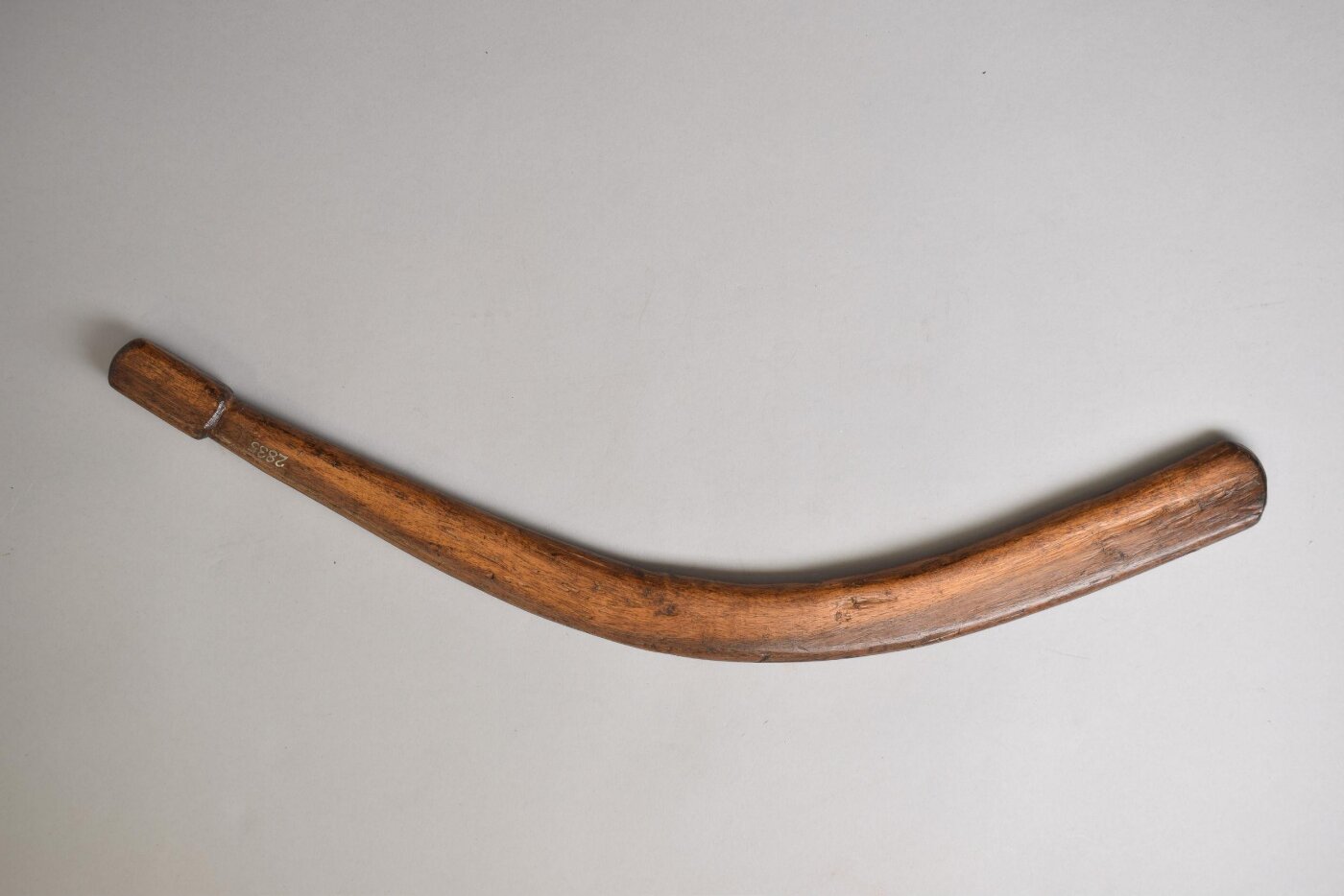 Carved wooden boomerang, with one end roughly triangular. Originally from Tirunelveli. Transferred from the India Museum in 1879.