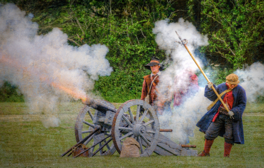 The Sealed Knot re-enactment group firing a cannon type typical of the artillery in the English Civil Wars (1642-51).