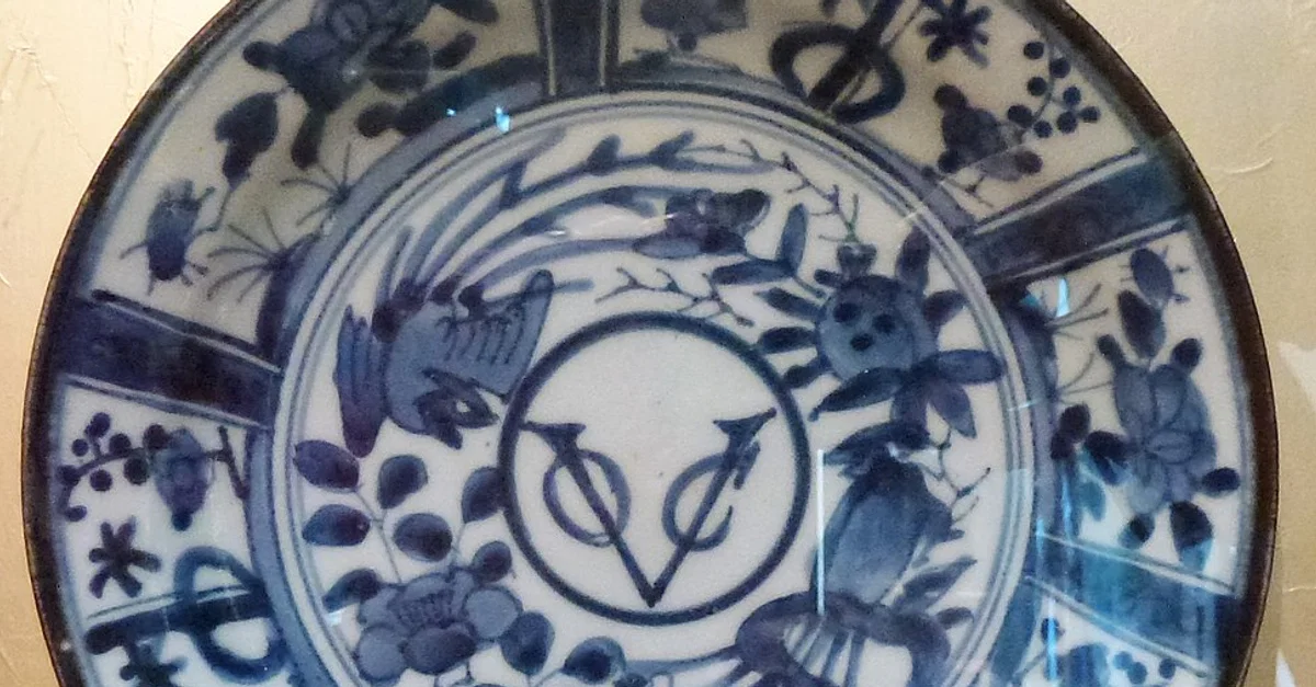Blue and white Dutch East India Company (Vereenigde Oostindische Compagnie or VOC) logo from 1650-1674. Made in Japan to order by the company's directors in Batavia (Jakarta). Date between 1615 and 1674.