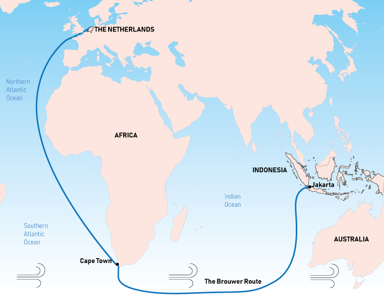 The Dutch East India Company's favoured route from Europe to southeast Asia was known as the Brouwer Route. It was discovered by Dutch explorer Hendrik Brouwer (c. 1581-1643) in 1611 and halved the sailing time from the Netherlands to the company's trading stations in southeast Asia.