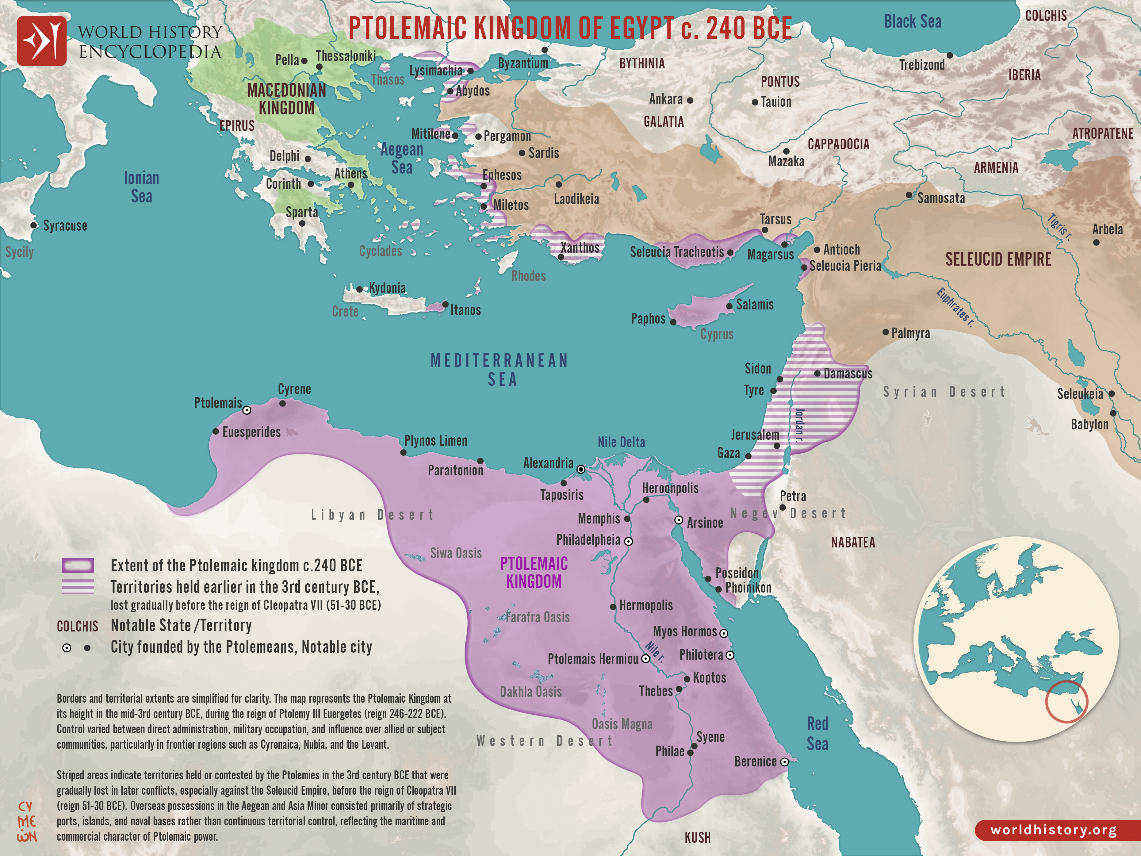 Netchev, S. (2026, April 26). Map of the Ptolemaic Kingdom of Egypt c. 240 BCE: Power, Wealth, and Rivalry in the Hellenistic World. World History Encyclopedia. https://www.worldhistory.org/image/15183/map-of-the-ptolemaic-kingdom-of-egypt-c-240-bce/