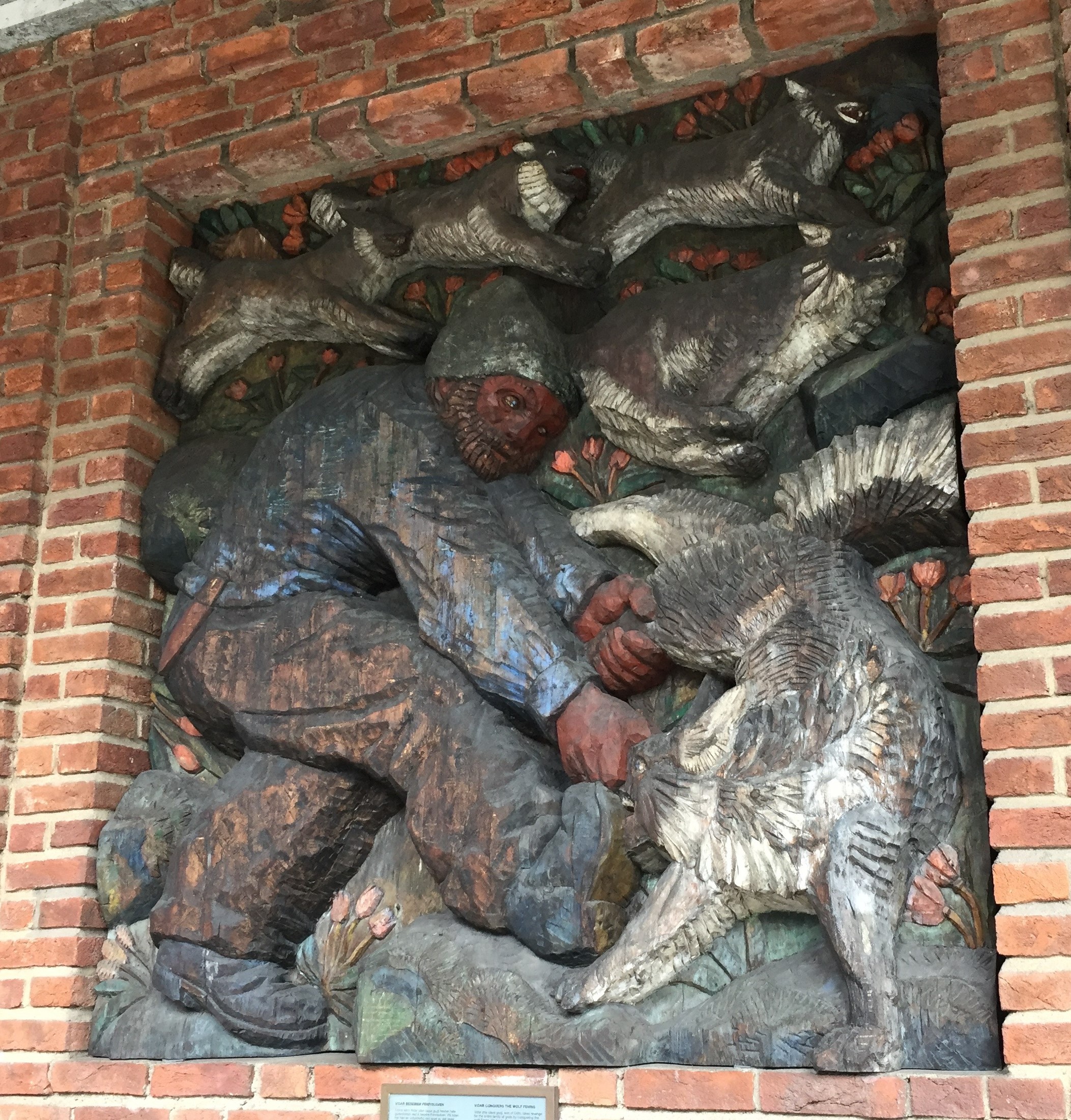 The Norse god Vidar kills the wolf Fenrir, wooden relief by Dagfin Werenskiold.