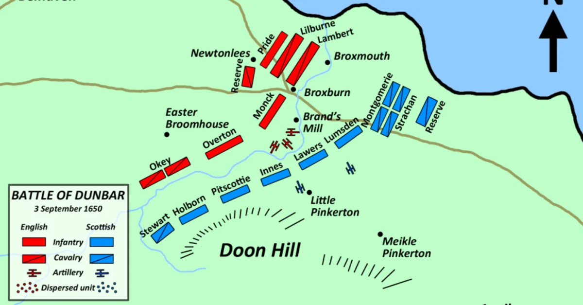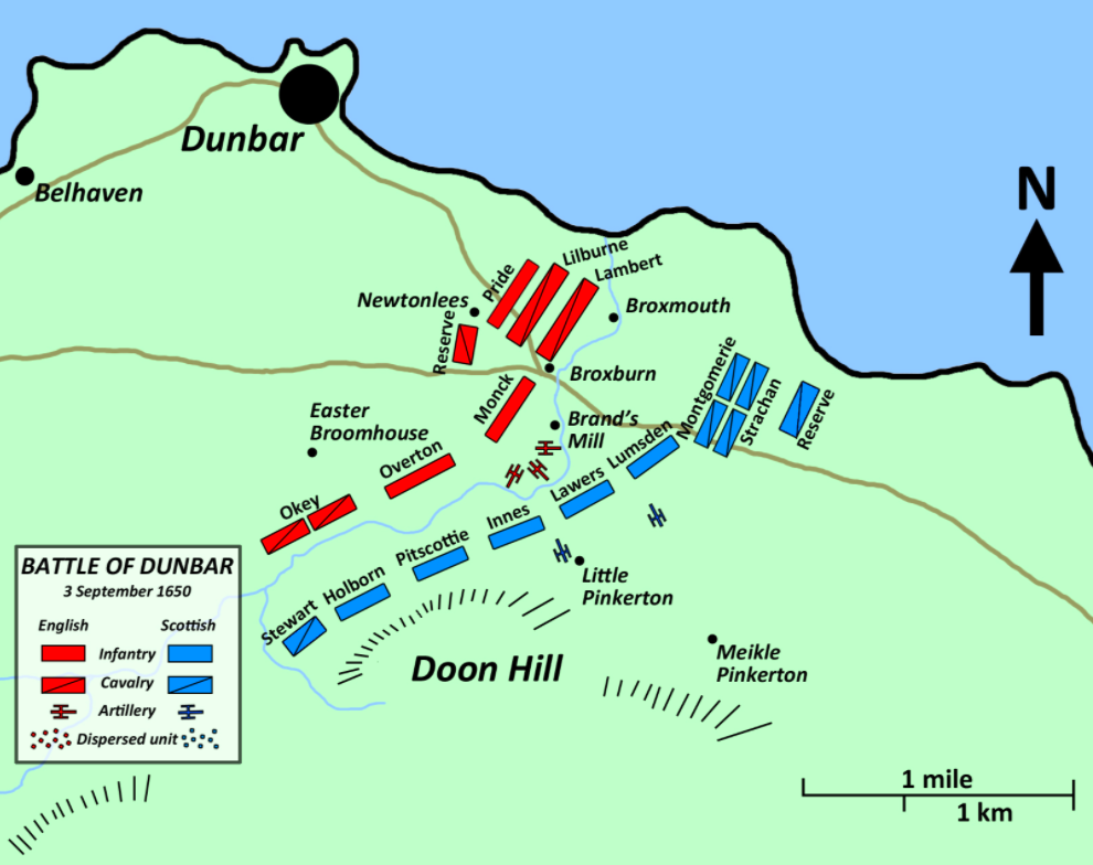 A map showing the troop dispositions of the Scottish and English armies at the battle of Dunbar in 1650 during the English Civil Wars (1642-51). Dunbar is located just over the Anglo-Scottish border on the east coast of Scotland. The English Parliament's New Model Army, led by Oliver Cromwell, won the battle.