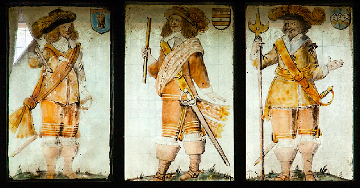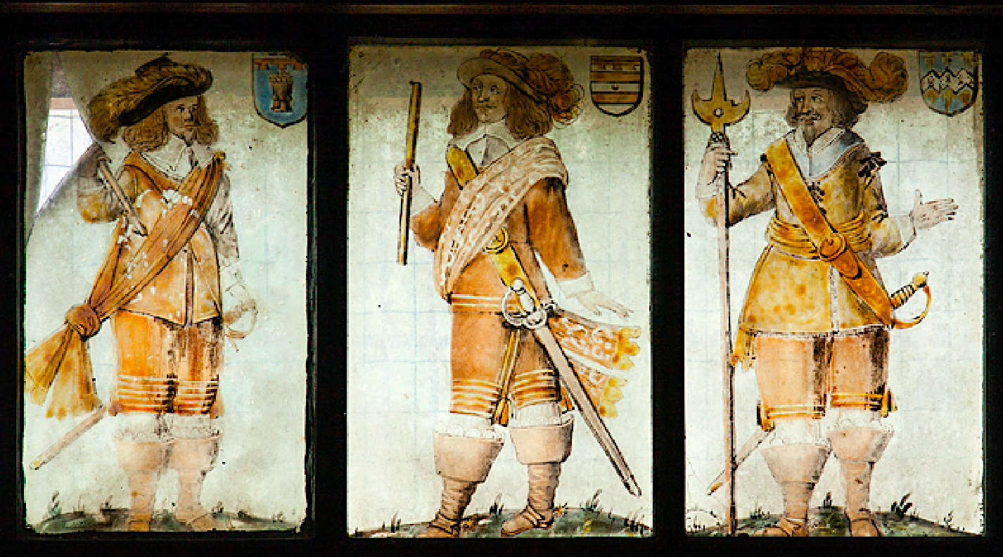 A detail of the Civil War memorial window showing different soldier types at St. Chad's Church, Farndon, Cheshire. Created after the Restoration of 1660.