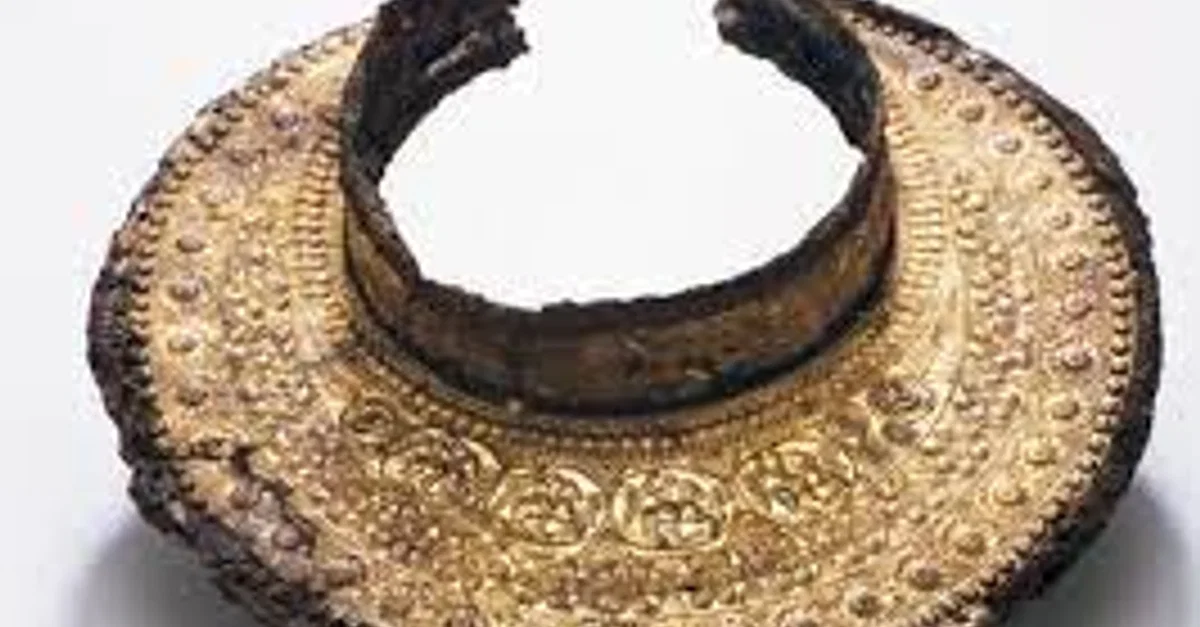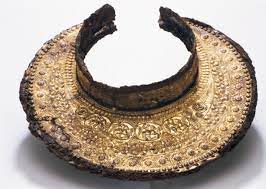 Iron peritrachelion (gorget) with golden-silver decorative plate found in Macedonian Tomb II of Vergina, Imathia, Central Macedonia, Greece. The tomb is dated to between the end of the 4th century BCE and the beginning of the 3rd century BCE. Located at Archaeological Museum of the Great Tumulus of Vergina, Central Macedonia.