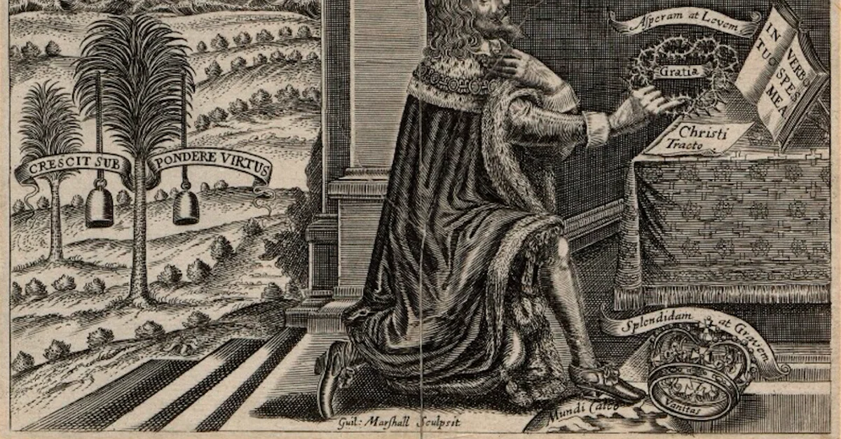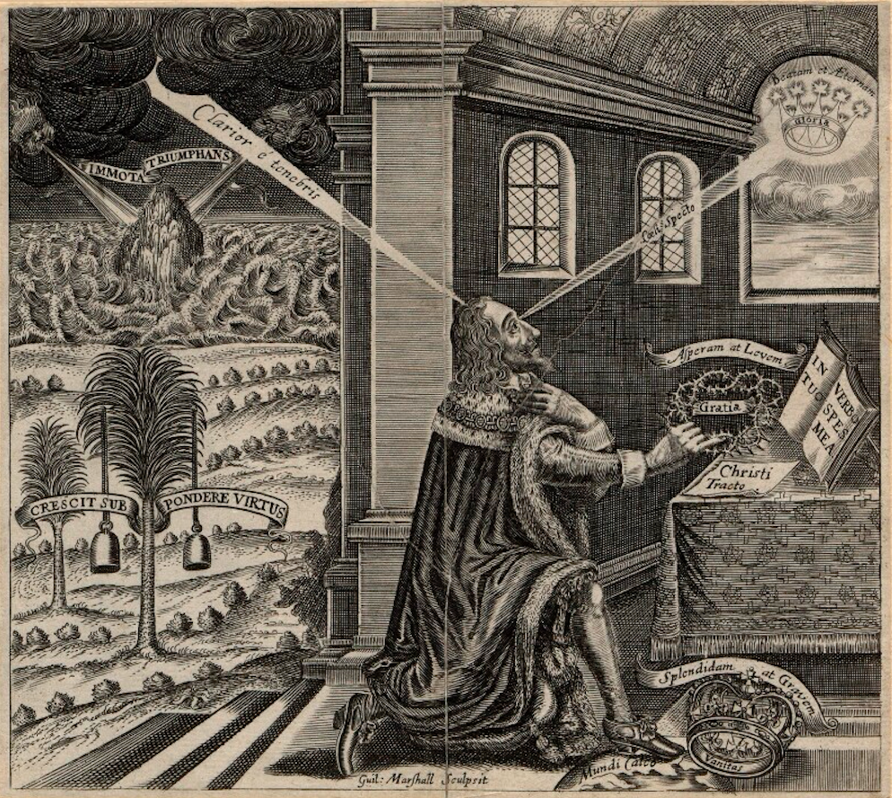 The frontispiece of the Eikon Basilike (first published in 1649) showing the late King Charles I of England (r. 1625-1649). The king, executed by Parliament during the English Civil Wars (1642-51), is here shown kneeling and holding forth a crown of thorns and is represented as the embodiment of a Christian monarch who rules in God's name and with his guidance.