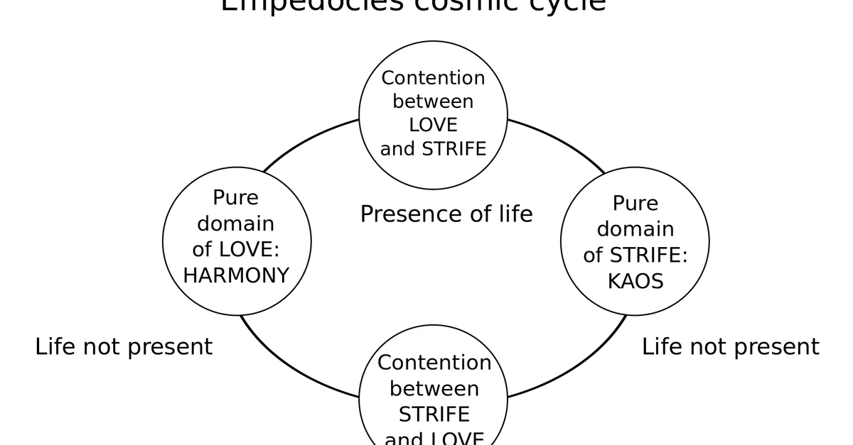Diagram of Empedocles' cosmic cycle showing the relationship between love and strife in the operation of the universe.
