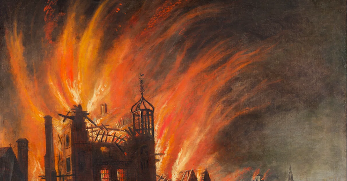A c. 1670 anonymous painting titled The Great Fire of London, with Ludgate and Old St. Paul's. The Great Fire of London ravished the English capital in September 1666 destroying over 13,000 buildings. (Yale Center for British Art, Yale University, New Haven, Connecticut, USA)