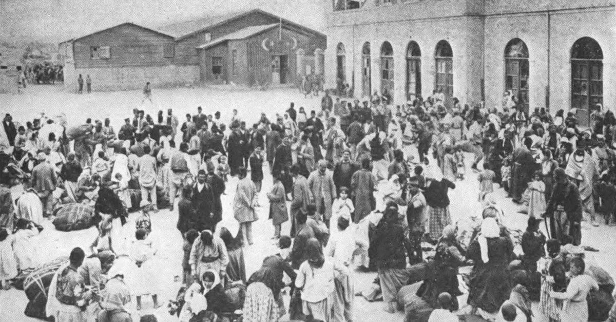 A photo presenting an episode of an Armenian Genocide which was a destruction of the Armenian people and culture in the Ottoman Empire. The photo presents group of armenians gathered in a city prior to deportation.