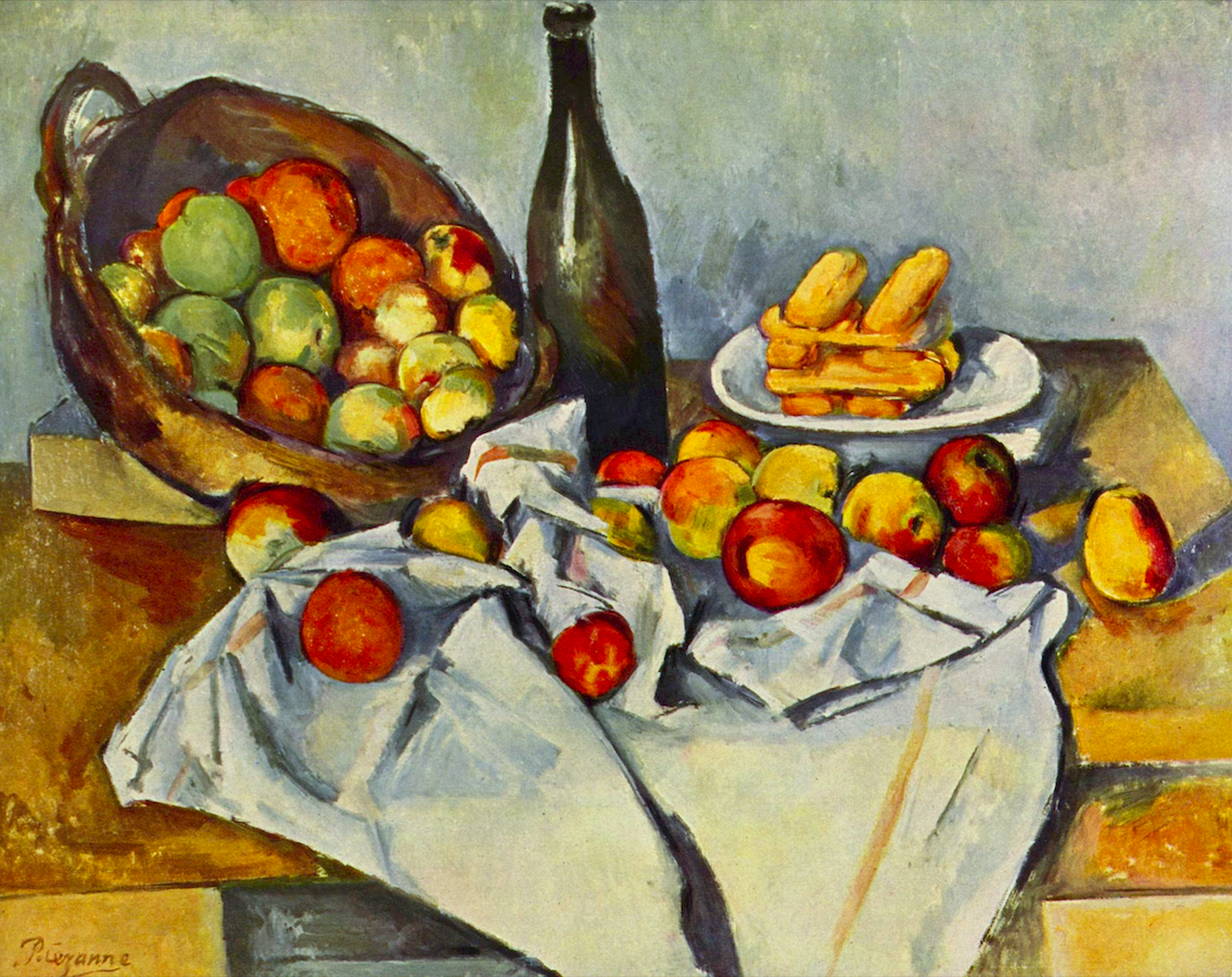 An 1890-94 still-life in oils, The Basket of Apples by Paul Cézanne (1839-1906), the French post-impressionist artist. Cézanne was a master of looking at ordinary objects from multiple viewpoints, a technique that would be much copied in art thereafter. (Art Institute of Chicago)