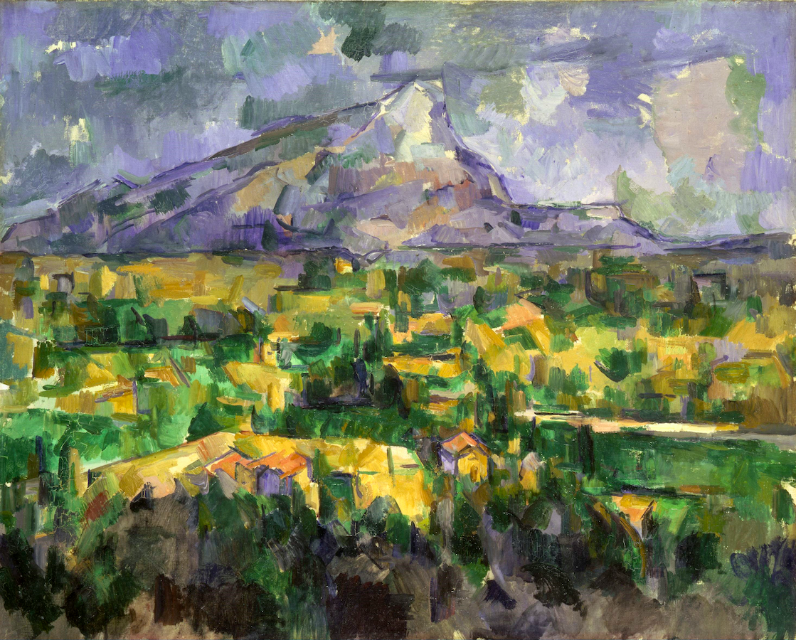 A c. 1903 landscape in oils, Mont Sainte-Victoire, by Paul Cézanne (1839-1906), the French post-impressionist artist. Cézanne painted the mountain, located in southern France just east of Aix-en-Provence, almost 60 times in all kinds of views and seasons and in various styles. This is one of his later versions and shows the artist's increasingly abstract style. (Philadelphia Museum of Art)