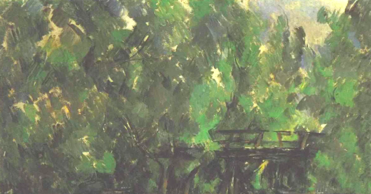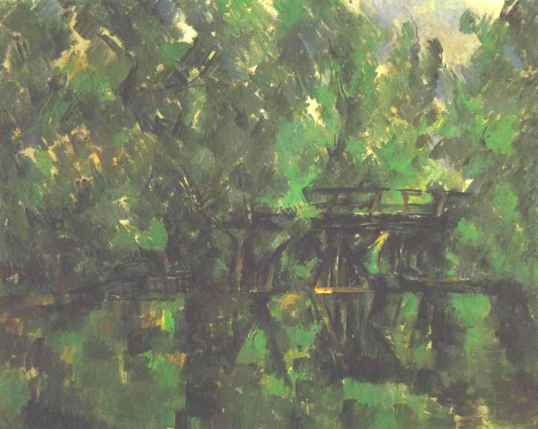 A c. 1898 landscape in oils, Bridge Across the Pond, by Paul Cézanne (1839-1906), the French post-impressionist artist. The work is an example of Cézanne's preoccupation with representing the underlying essence or structure of Nature rather than showing it at a particular moment in a particular light. The precise use of brushstrokes in multiple directions and layers is typical of the artist in this period, as is the use of multiple colour shades and tones. (Museum of Fine Arts, Moscow)