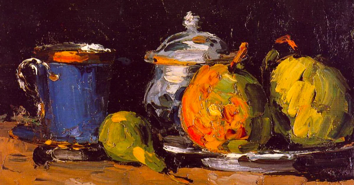A c. 1866 still life in oils, Sugar Bowl, Pears, and Blue Cup, by Paul Cézanne (1839-1906), the French post-impressionist artist. The dark background, vibrant and contrasting colours, and thick application of paint with a palette knife are all typical of Cézanne's early work. (Musée Granet, Aix-en-Provence, France)