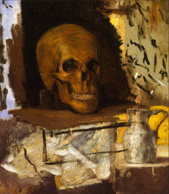 A c. 1864 still life in oils, Skull and Jug, by Paul Cézanne (1839-1906), the French post-impressionist artist. Cézanne painted several skulls, symbolic of the transience of life. (Private Collection)
