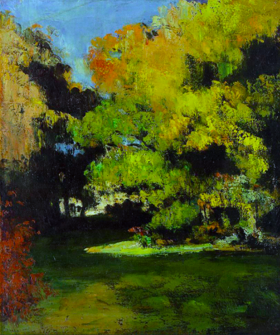 An 1867 painting in oils, The Clearing, by Paul Cézanne (1839-1906), the French post-impressionist artist. One of the clearest indications of the influence of impressionism on Cézanne. The artist is using a broader range of colours and shades to achieve his effects and create spatial depth. (Private Collection)