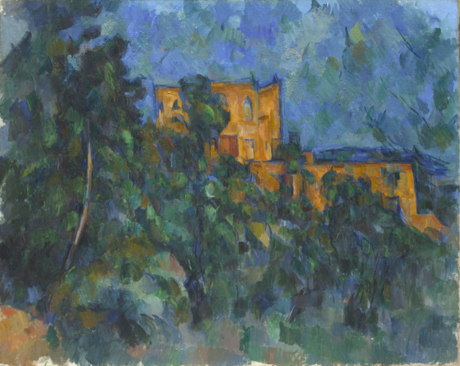 A 1903-4 painting in oils, Château Noir, by Paul Cézanne (1839-1906), the French post-impressionist artist. The Cháteau Noir was a collection of faux ruins near Aix in southern France and they tempted the artist into painting them several times, all in a brooding atmosphere of dark greens and blues. Typical of his later work, the paint is here applied in thick, broad strokes that often take a geometrical form. Another feature of the artist's later style is the tendency to leave the edges of the scene unpainted. (Metropolitan Museum of Art, New York)