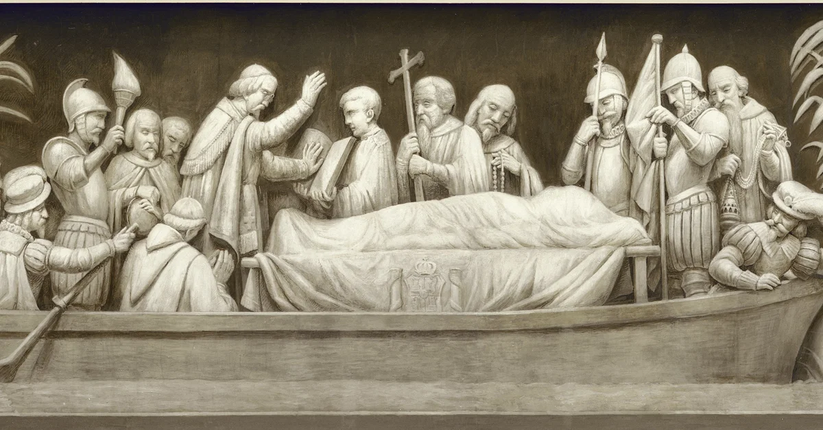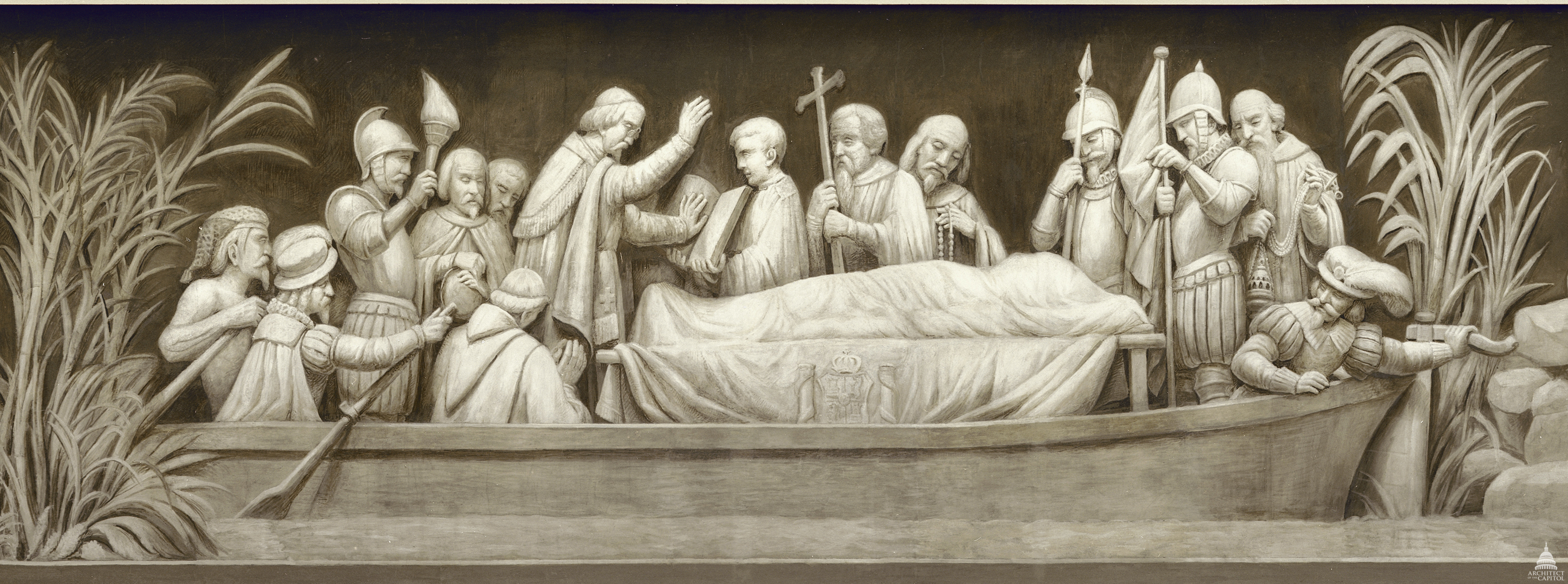Frieze depicting the burial of Spanish explorer Hernando de Soto in the Mississippi River in 1542.