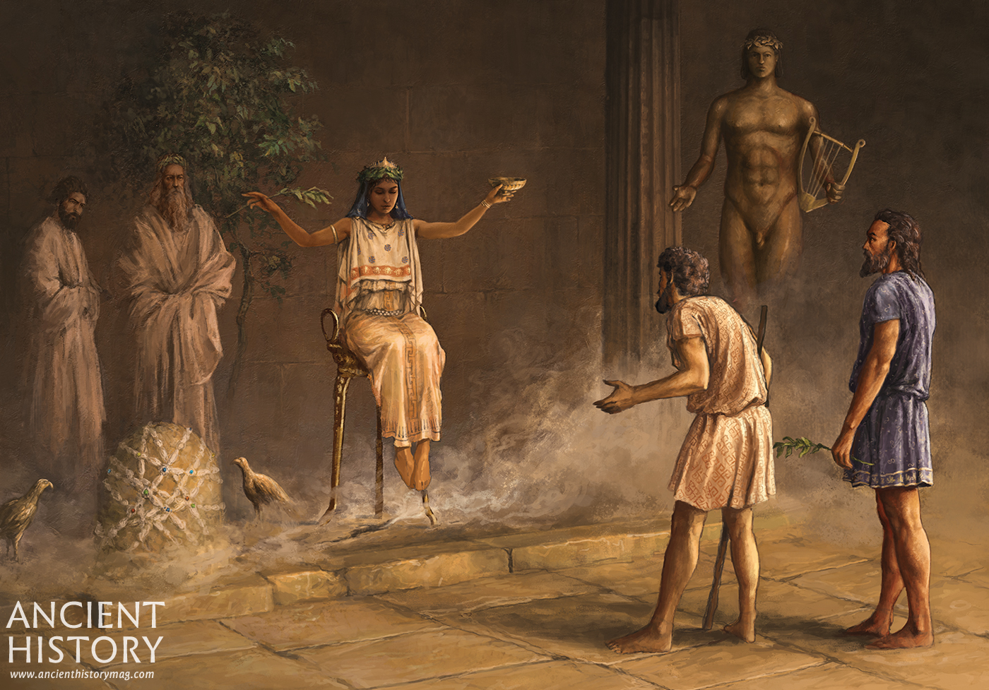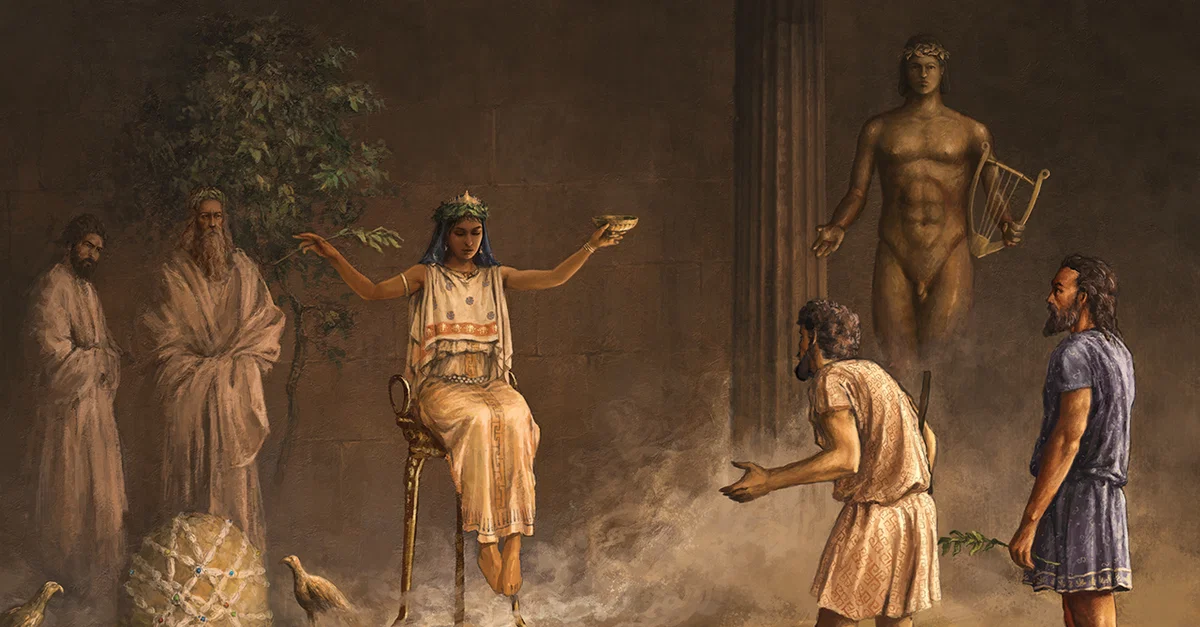 Two Greek nobles consult with the Oracle at Delphi before setting out to establish a new colony abroad. Art by Mateusz Przeklasa.