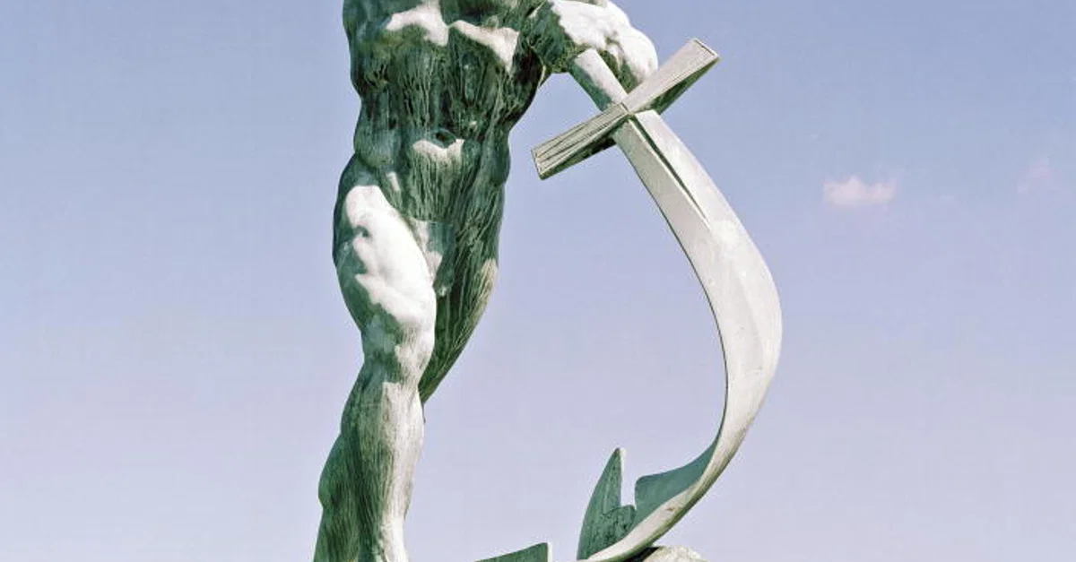 Let Us Beat Our Swords into Ploughshares, a bronze sculpture by Soviet artist Evgeny Vuchetich, presented to the United Nations on 4 December 1959.