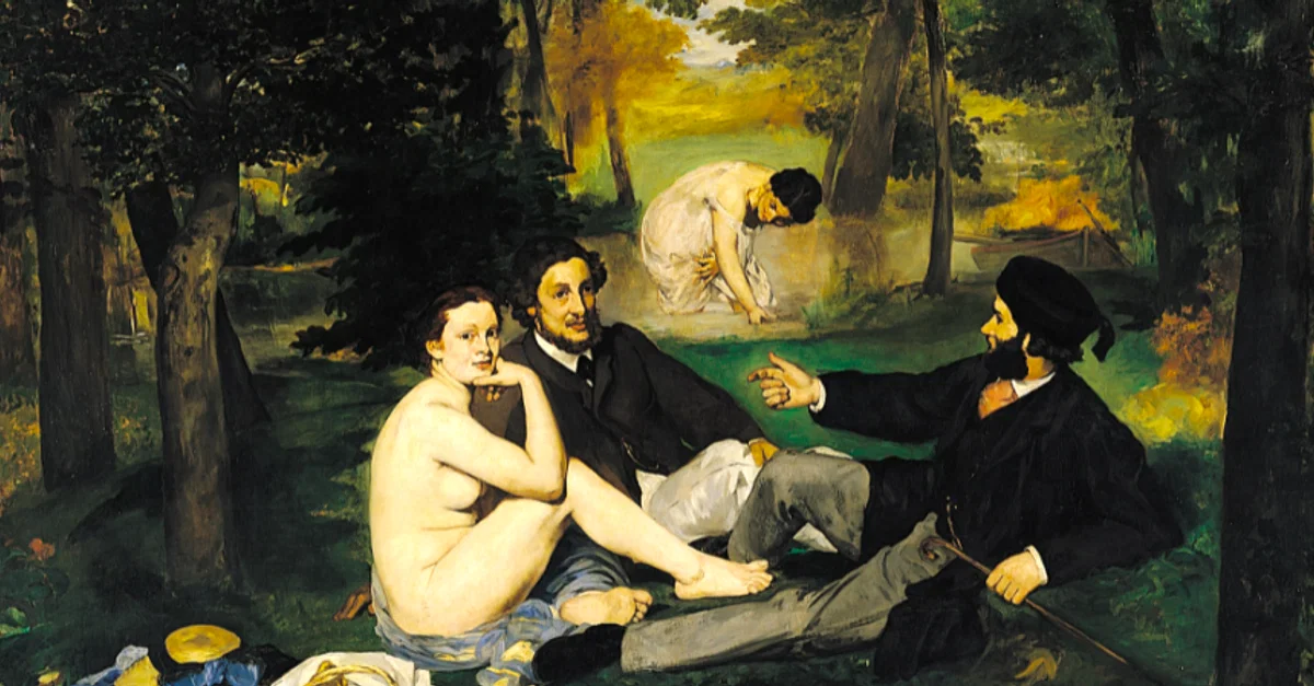 An 1863 oil on canvas painting, Lunch on the Grass (Déjeuner sur l’herbe), by Edouard Manet (1832-83), the French modernist painter. This painting shocked the art world when displayed in the Salon des Refusés for placing a nude female figure amongst contemporary dressed men. Clearly a courtesan, the woman's frank stare at the viewer, the obvious brushstrokes, and bright colouring all further annoyed critics who missed Manet's reuse of a group composition from Renaissance art. Emperor Napoleon III (r. 1852-70) described it as "an offence against modesty." (Musée d'Orsay, Paris)