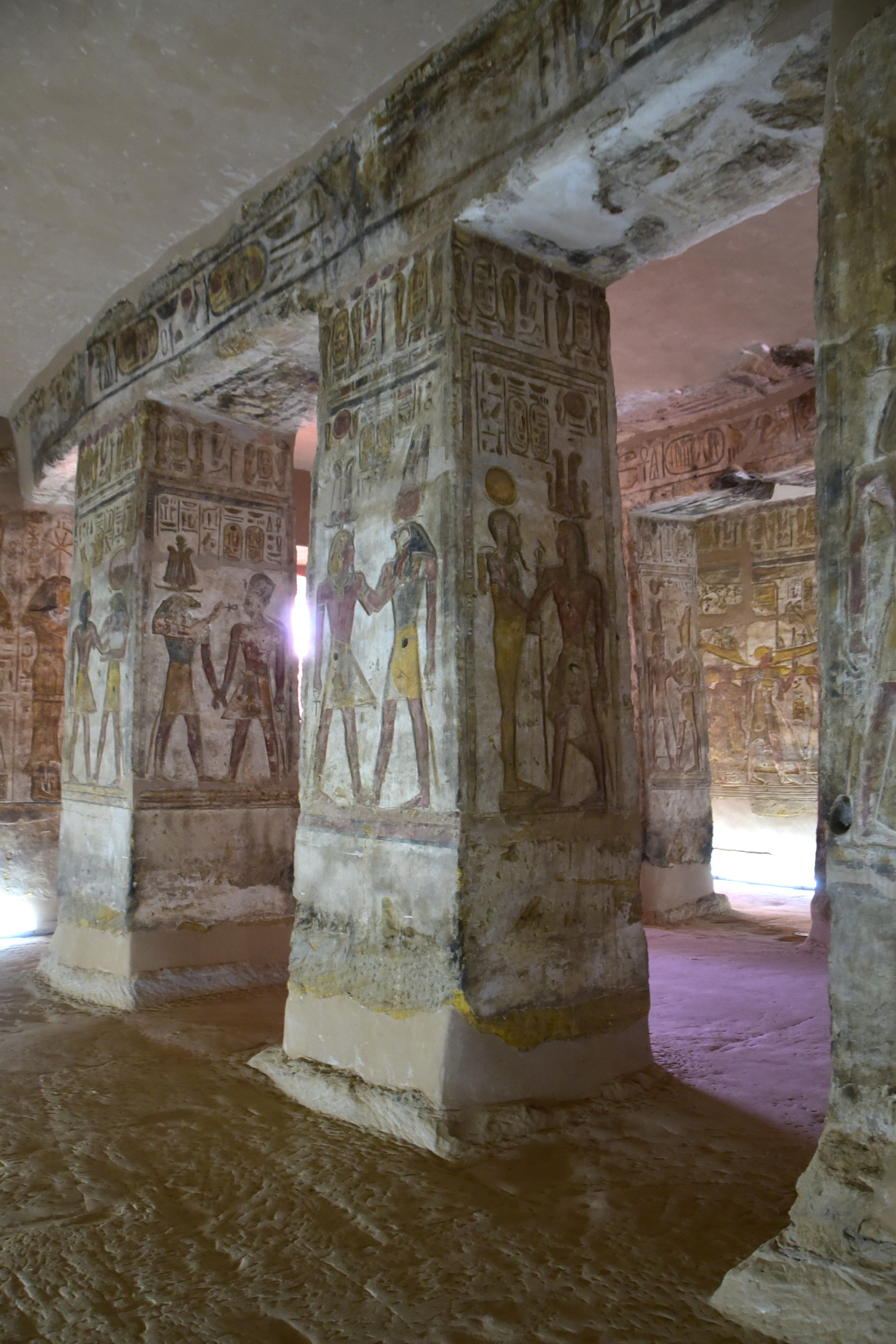 The Temple of Derr is a rock-cut temple built by Ramesses II (r. 1279-1213 BCE) and dedicated to Re-Harakhte, Amun-Re and Ptah. It is located at the site of New Amada, an archaeological complex containing three ancient Nubian monuments spared from the rising waters of Lake Nasser. The temple contains two hypostyle halls and three chambers, the central one containing cult statues of the three gods worshipped here and the deified Ramesses II. The temple features some unusually bright painted reliefs with vivid colours.