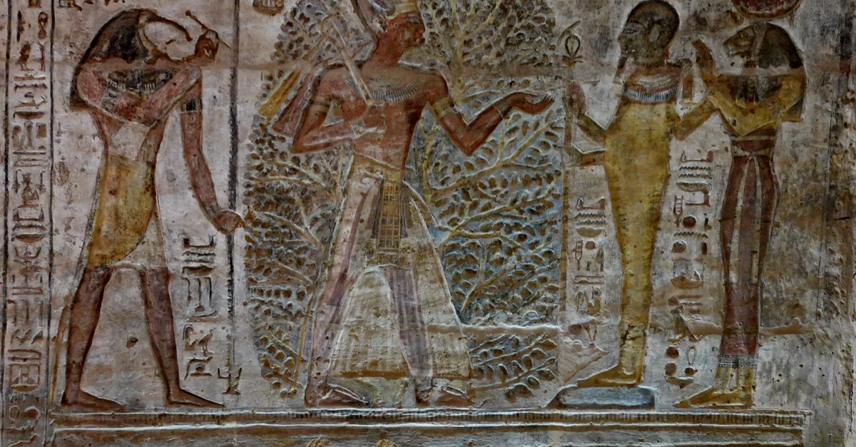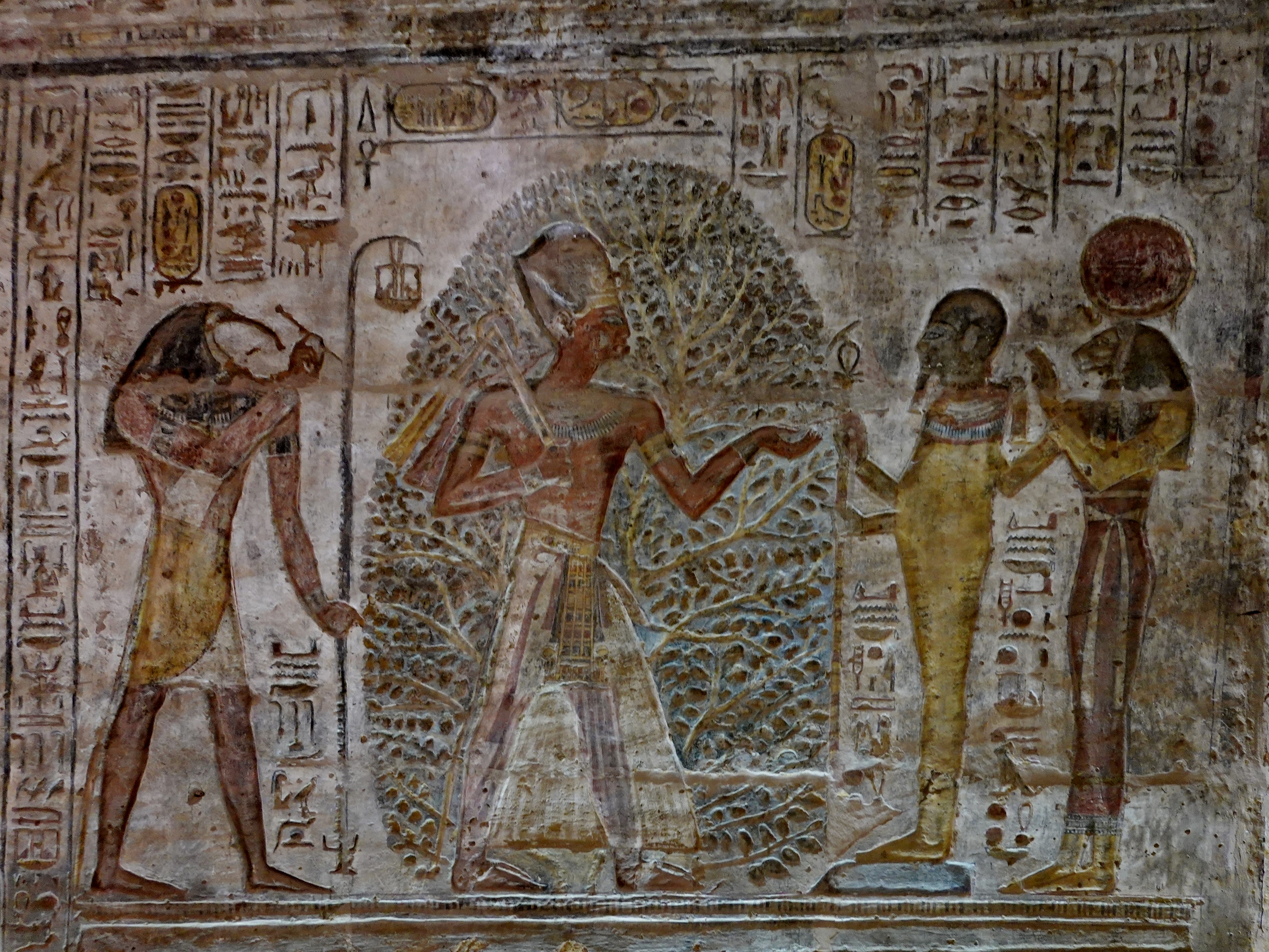 A depiction of Ramesses II in the sacred Tree of Life before Ptah and Sekhmet, with Thoth behind him. Relief on the north wall of the second pillared hall in the Temple of Derr on Lake Nasser, Egypt. The Temple of Derr is a rock-cut temple built by Ramesses II (r. 1279-1213 BCE) and dedicated to Ra-Harakhte, Amun-Ra and Ptah.