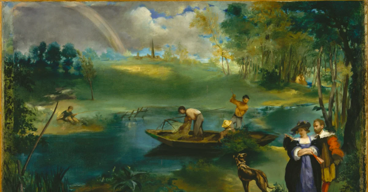 A c. 1862 oil on canvas painting, Fishing, by Edouard Manet (1832-83), the French modernist painter. The couple on the right is the artist and his then mistress Suzanne Leenhoff. The work shows the artist's interest in painters like Peter Paul Rubens (1577-1640) in the early part of his career. The work was exhibited in St. Petersburg. (Metropolitan Museum of Art, New York)