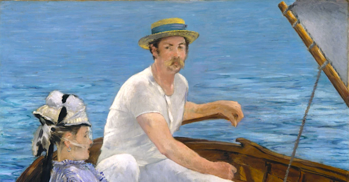 An 1874 oil on canvas painting, Boating, by Edouard Manet (1832-83), the French modernist painter. Painted at Argenteuil on the Seine. Typical of Manet's work, the two figures seem disconnected from each other, and the scene is very flat as in the Japanese prints that had become popular in Europe in this period. Another feature from Japanese art is the abrupt cutting of the scene. The work was exhibited in the 1879 Paris Salon. (Metropolitan Museum of Art, New York)