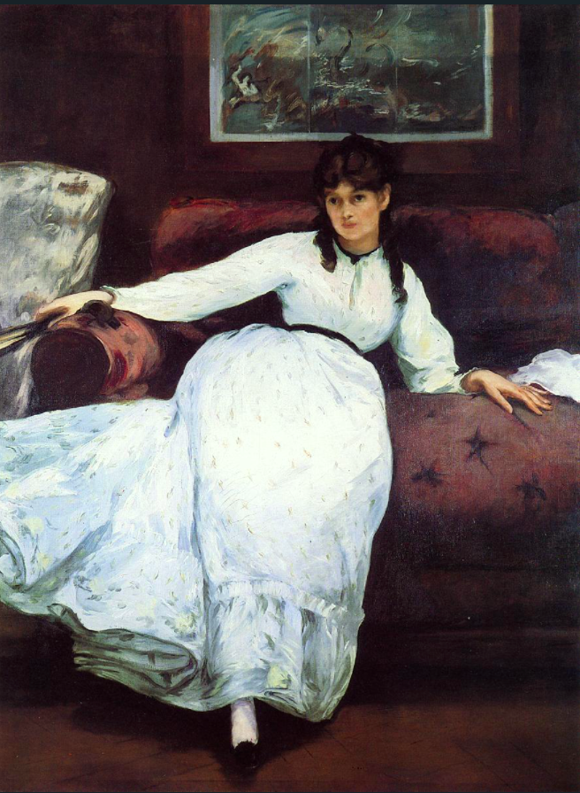 An 1869-70 oil on canvas painting, The Repose, by Edouard Manet (1832-83), the French modernist painter. The woman is Berthe Morisot, the impressionist painter who frequently modelled for Manet. The pose is highly unconventional for the period (especially the glimpse of stocking), much like the sitter herself. The Japanese print above her head belonged to Manet. (Rhode Island School of Design Museum, U.S.A.)