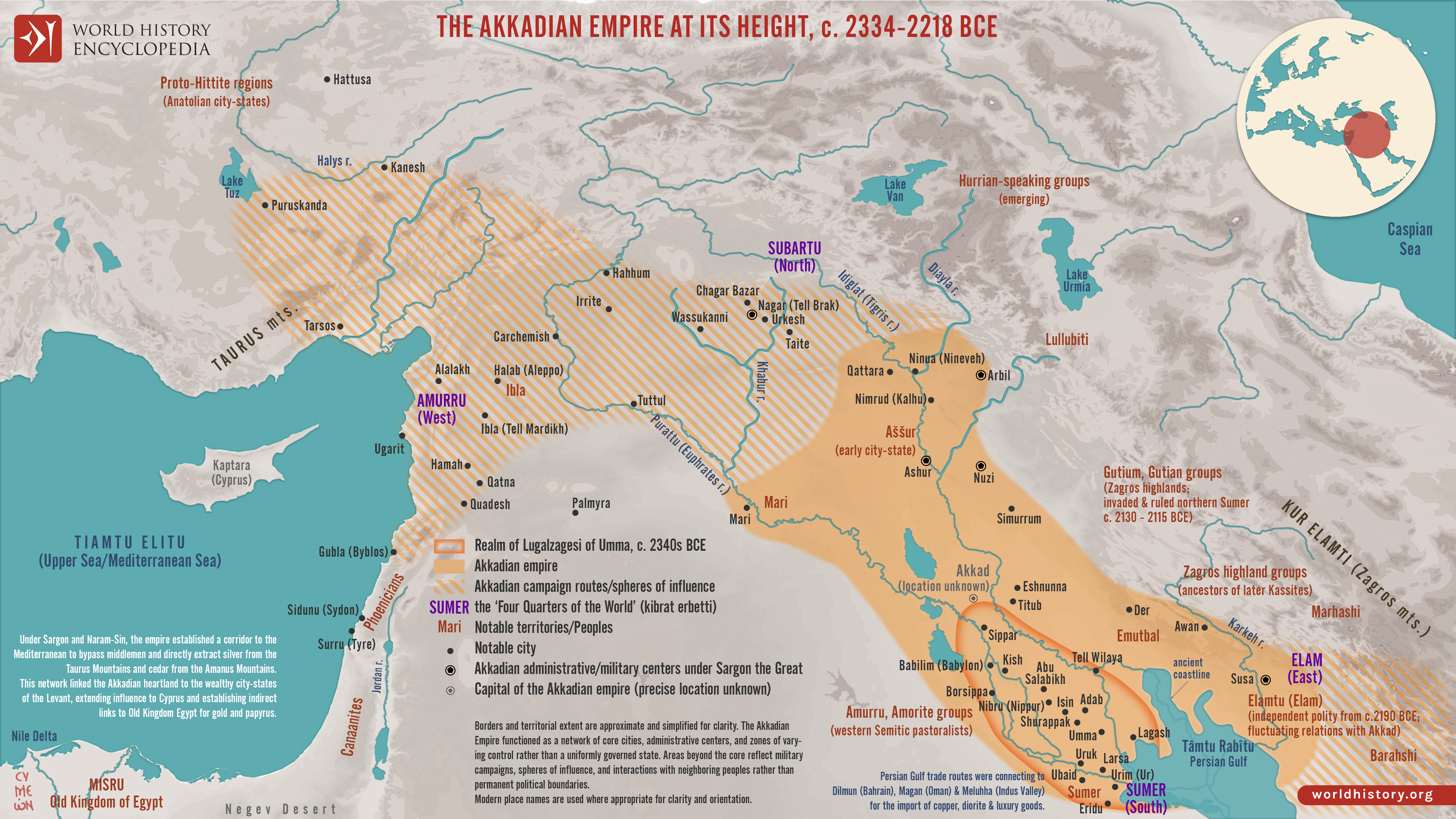 Netchev, Simeon. "Map of the Akkadian Empire at Its Height: Ruling the Four Quarters of the World." World History Encyclopedia, 02 Apr 2026, https://www.worldhistory.org/image/15457/map-of-the-akkadian-empire-at-its-height/.