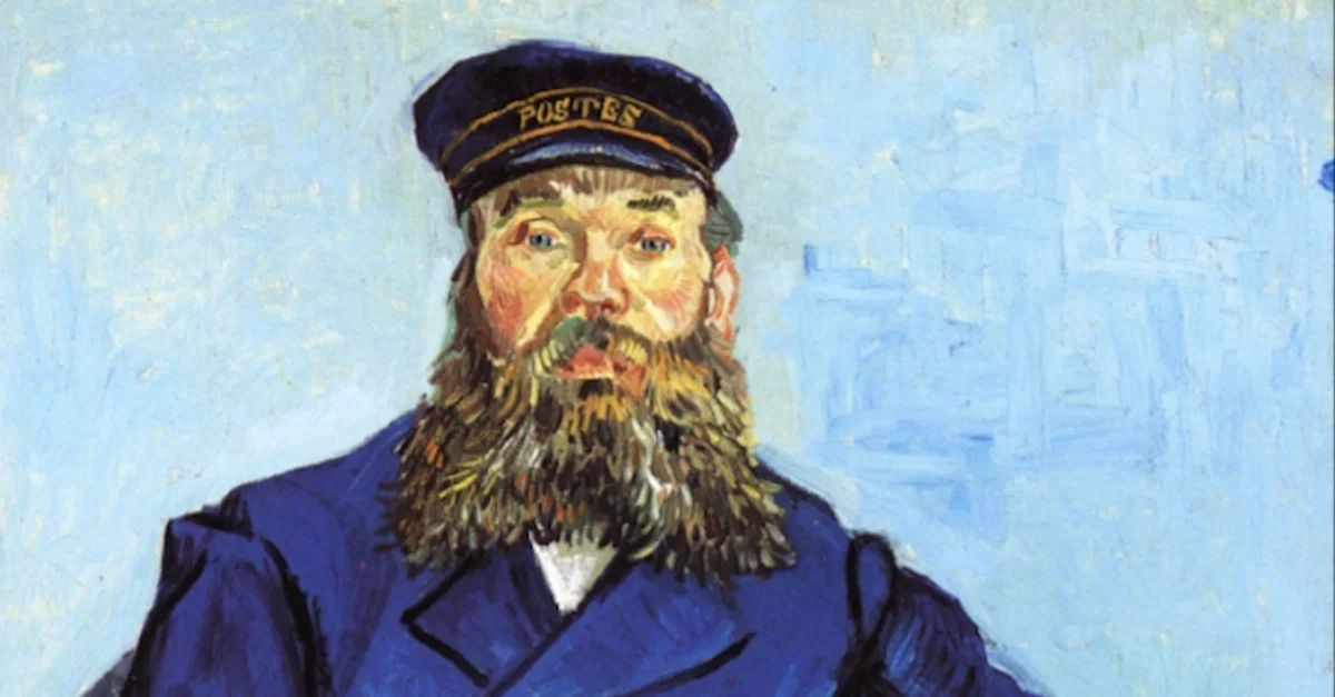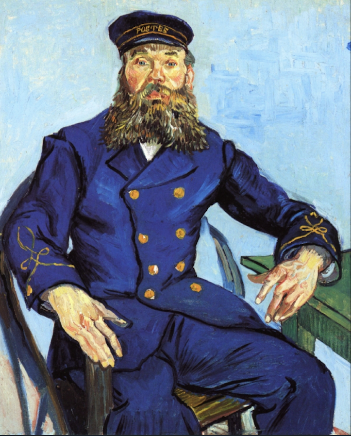 Right now I'm working on the portrait of the postman in his uniform of dark blue with yellow. A head a bit like Socrates, almost no nose, a high forehead, bald crown, small grey eyes, highly coloured plump cheeks, a big pepper-and-salt beard, large ears. The man is a well known republican and socialist, argues quite well and knows a great deal. His wife gave birth to a child today, so he's in fine fettle and beaming with satisfaction. (LW 5D)