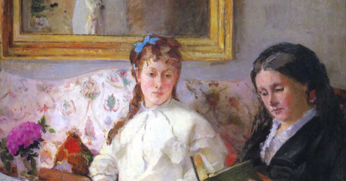 An 1869-70 oil on canvas painting, Reading, by Berthe Morisot (1841-95), the French impressionist painter. The two women are Morisot's mother Cornélie (on the right) and sister Edma (left). Morisot's friend, the artist Edouard Manet (1832-1883), made several adjustments to Cornélie's dress – not perhaps coincidentally, black was Manet's favourite colour. The work was shown in the 1870 Paris Salon. (National Gallery of Art, Washington DC)