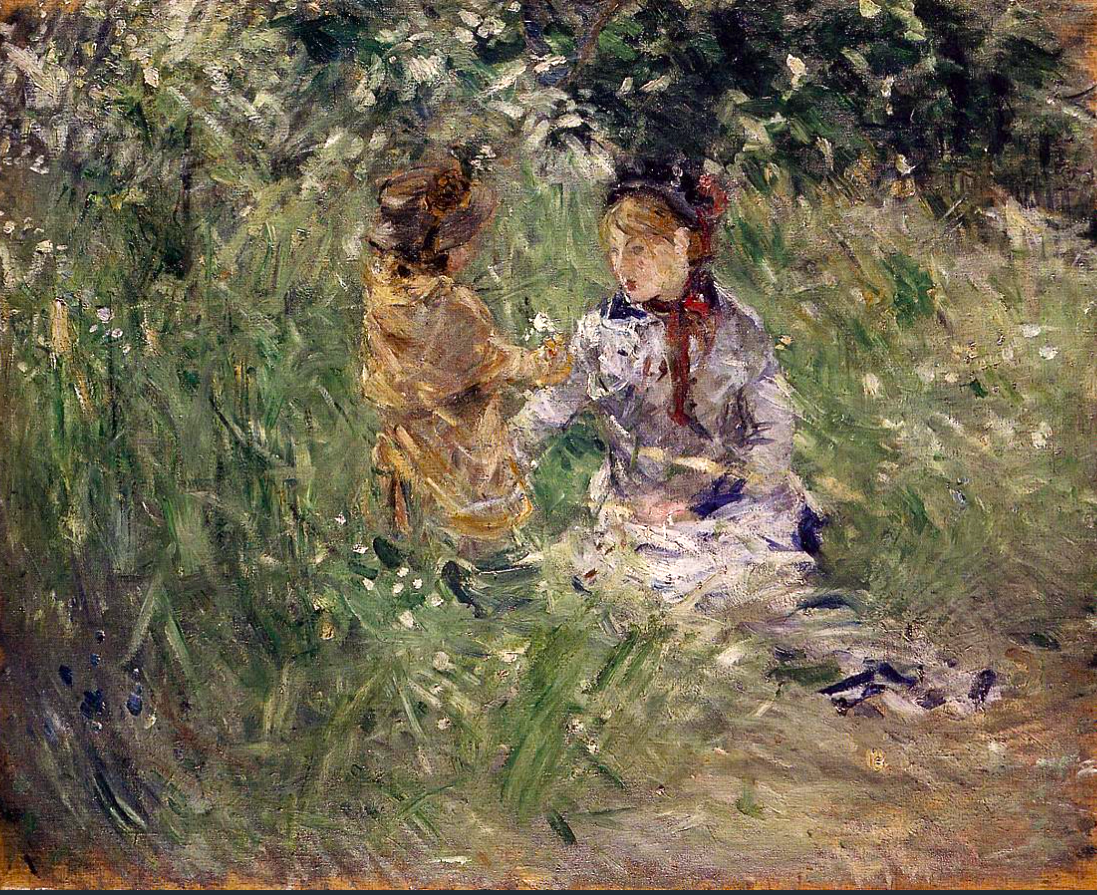 An 1882 oil on canvas painting, Julie with Pasie in the Garden at Bougival, by Berthe Morisot (1841-95), the French impressionist painter. Julie was the artist's daughter and Pasie was the nanny. This work appeared in an exhibition of impressionists in New York in 1886. It shows the long, lucid, and often diagonal brushstrokes typical of the artist's style. (Amgueddfa Cymru - National Museum of Wales, Cardiff)